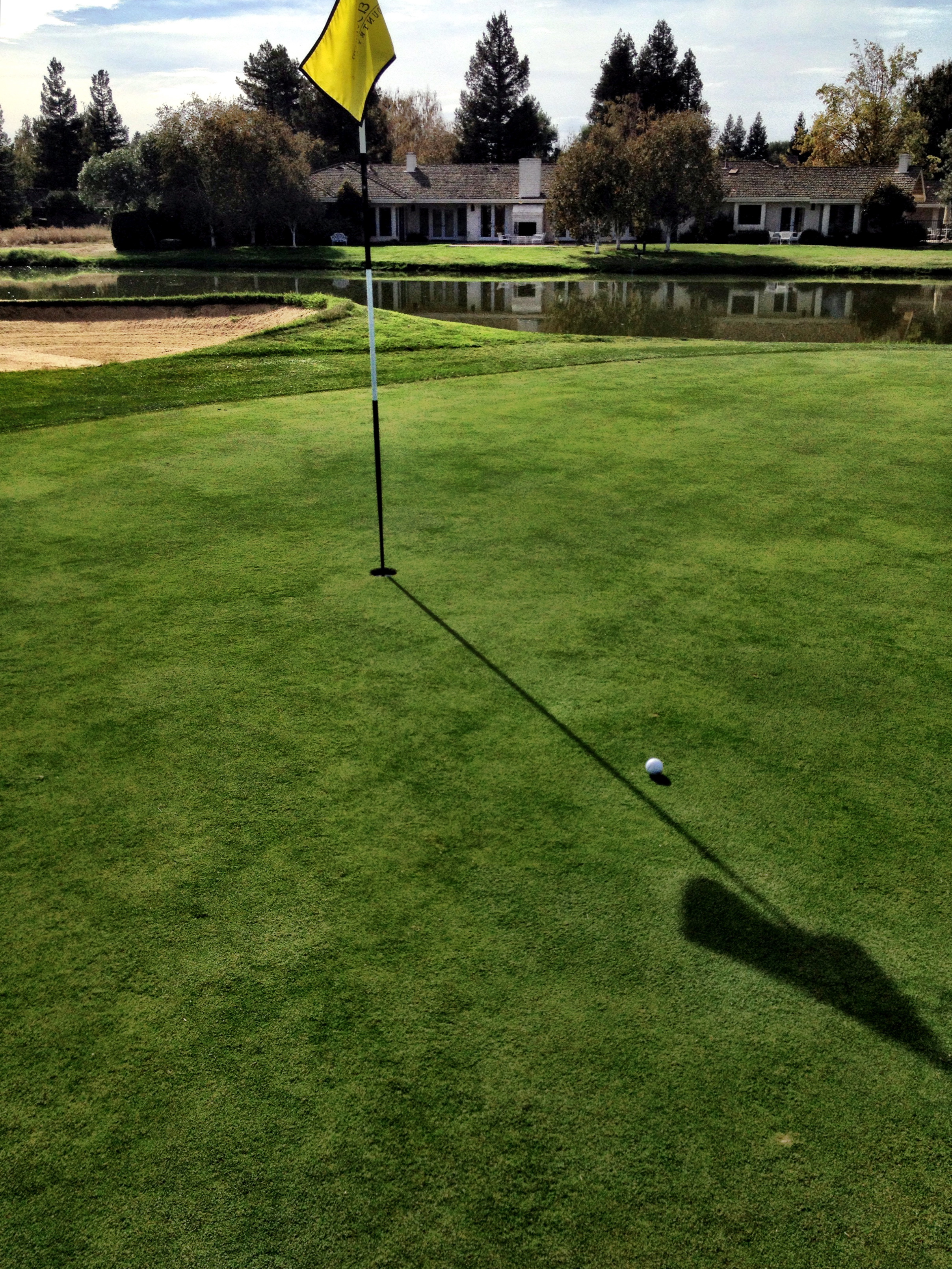 I used to play there, though unbelievably, I remembered very little of the course. I do remember well, however, the seventh hole, site of my one and only hole-in-one, back in about 1991. John was my witness then and still remembered it.. I was glad about that. It was also my best hole today–I think my only par.  This was my tee shot (I am not kidding), which beautifully cleared both the water and the bunker.  These shots bring them back!