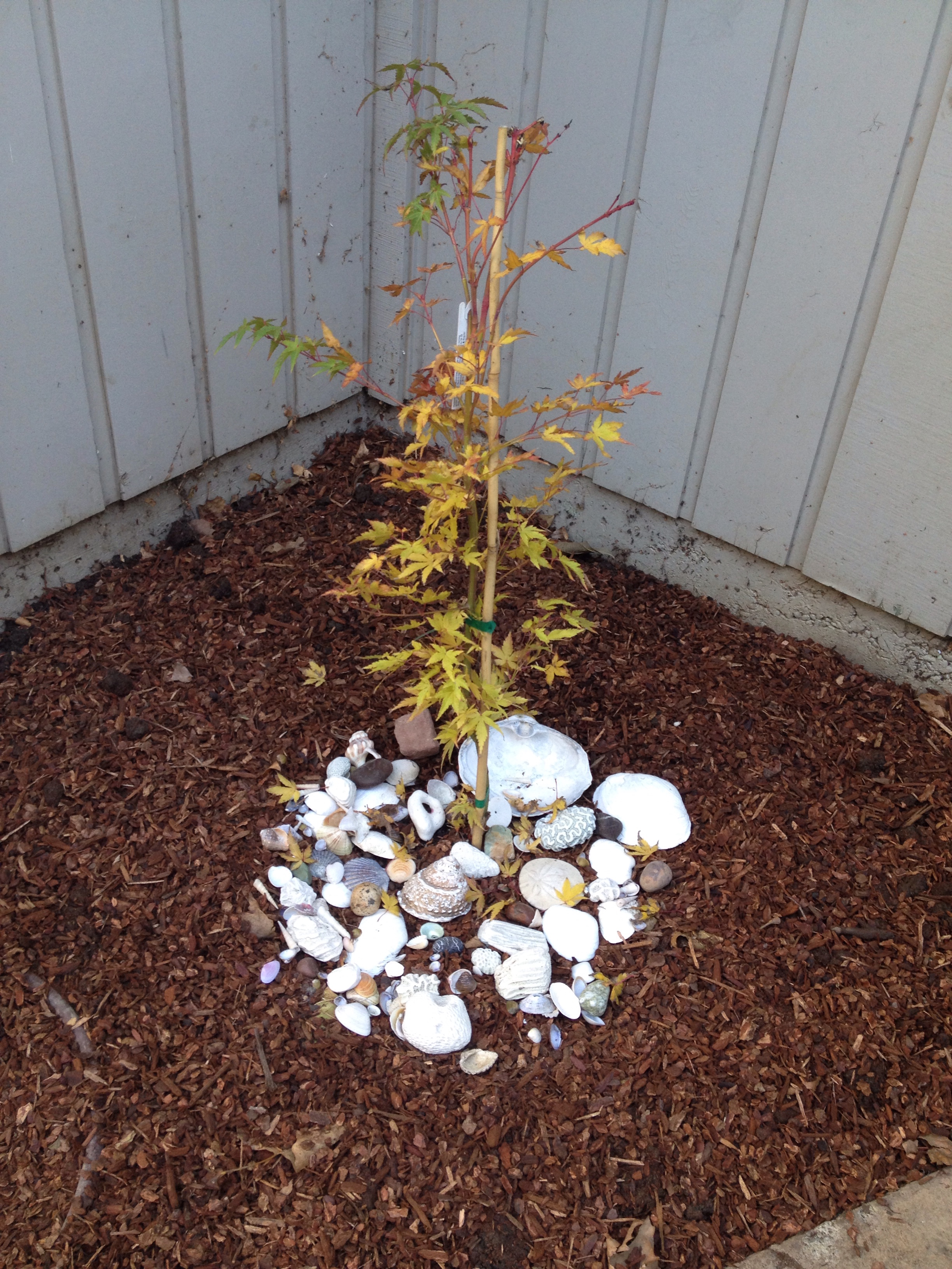 The shells and coral were collected from beaches all over–Dillon, Brazil, Palos Verdes, Monterey, Mexico, Hawaii. The rocks, probably Sierra. Until two days ago, they sat on shelves in decorative ceramic bowls, trays, cups.. some little shells sat in bigger shells. It was getting a little out of hand. During the bookcase reorganization project last weekend, I’d gathered them all up, put them in a baggie, and wondered what I’d do with them.. until today when I decided they’d make a nice garden embellishment.