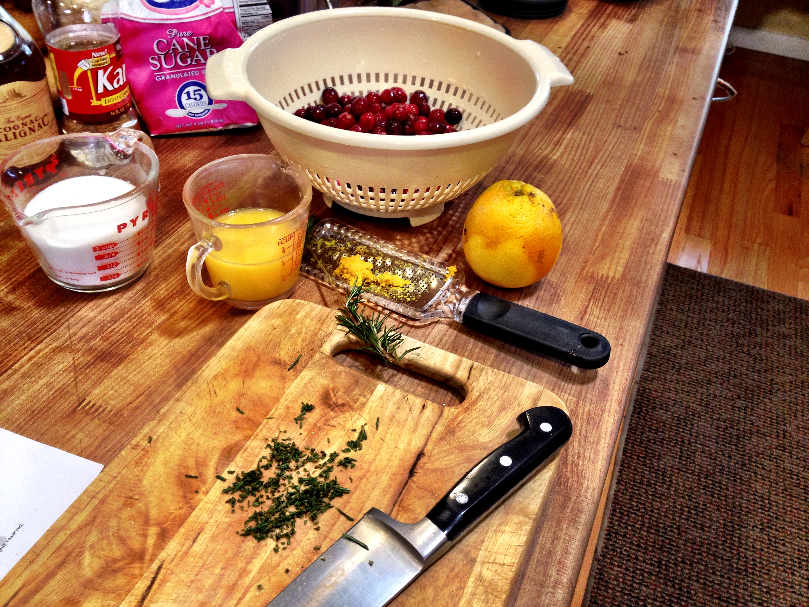 Then Frances’ cranberry sauce; this was a huge hit last year. Here’s a shot of the ingredients…it’s the orange zest and rosemary that make this so amazing: