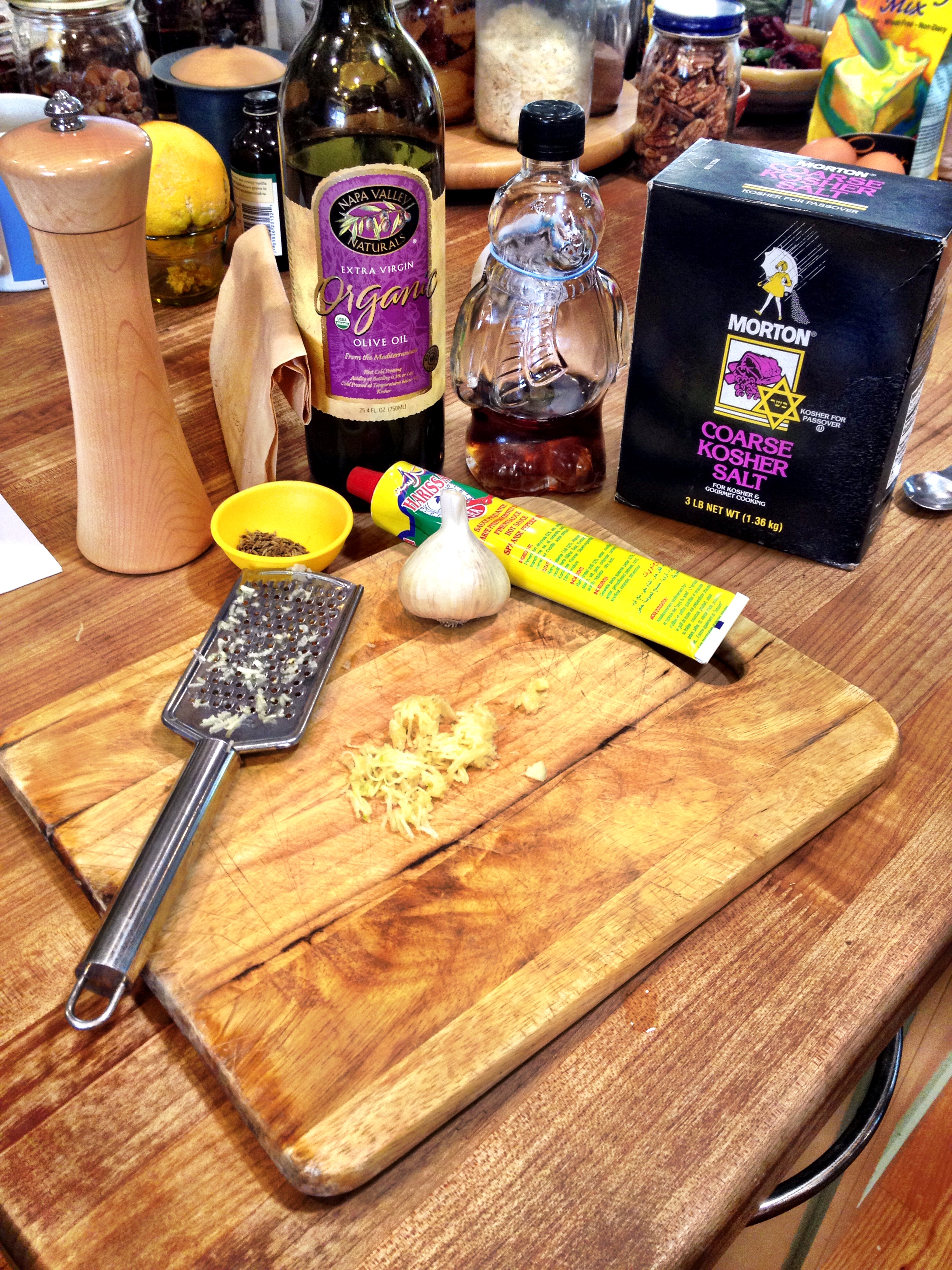 They and some thinly sliced lemon will get tossed with a marinade of grated garlic, olive oil, maple syrup, harissa (super hot chile paste), cumin seeds, s&p.