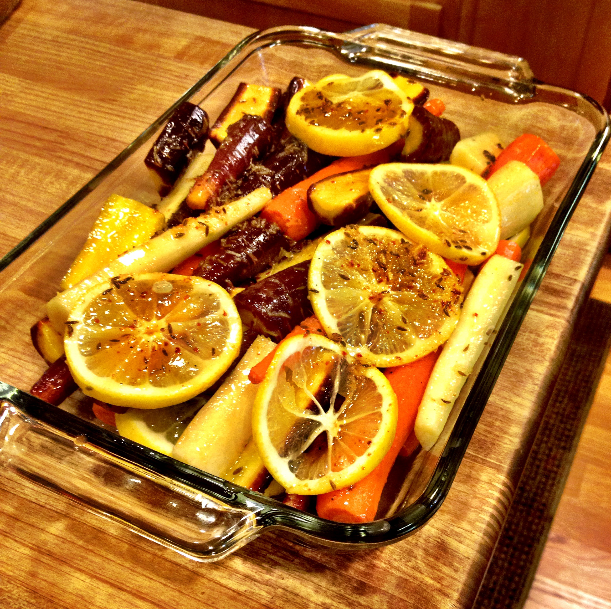 This is the dish I was most excited about… it sounds and looks exotically wonderful–rainbow carrots tossed with maple syrup, harissa paste, garlic, olive oil and cumin seeds, roasted with lemon–right?