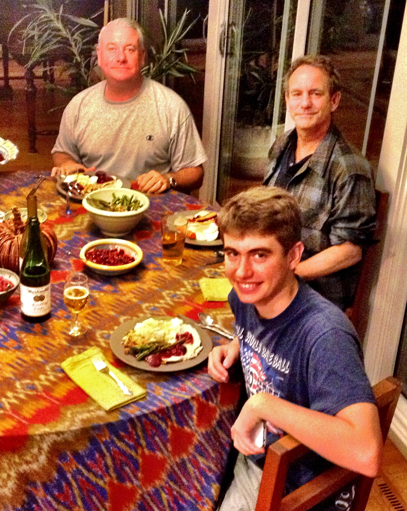 We did a non-Peterson thing–went around the table, each of us saying what we were grateful for. It’s one of those lessons in life: you never know what is in a person’s heart. Sometimes just asking opens a person up in unexpected ways. For me, it was a highlight. I got to genuinely thank everyone for making the trip, for our whole family–minus dad–being together, for my mom being healthy enough to celebrate a Northern California Thanksgiving, and to share with them my deep gratitude for my sick, but ordinarily wonderful, husband and light-of-my-life son. All of that felt good. And everyone else shared heartfelt thanks and gratitudes. Peter’s had to do with appreciating all we have when others around the planet are not so fortunate.