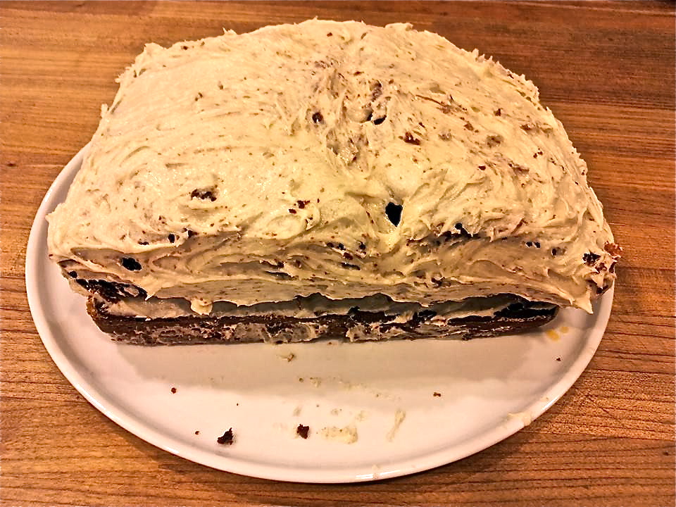 After a Facebook query, Jim got some suggestions and commenced to repair the damage this morning. First, he removed all the frosting, then shaved off enough of the cake to make the top and bottom layers flat. In the meantime, he’d made a batch of thin butter cream frosting to use as both mortar and a primer coat of sorts. He smeared a layer onto the bottom and re-stacked the second sheet, then covered the whole thing in a thin layer of his thinned-down frosting. He then stirred the old frosting together with all the bits of chocolate cake that had adhered to it during its removal, and created a new batch of coffee-colored frosting with cake bits embedded. This he spread all over the re-formed cake.