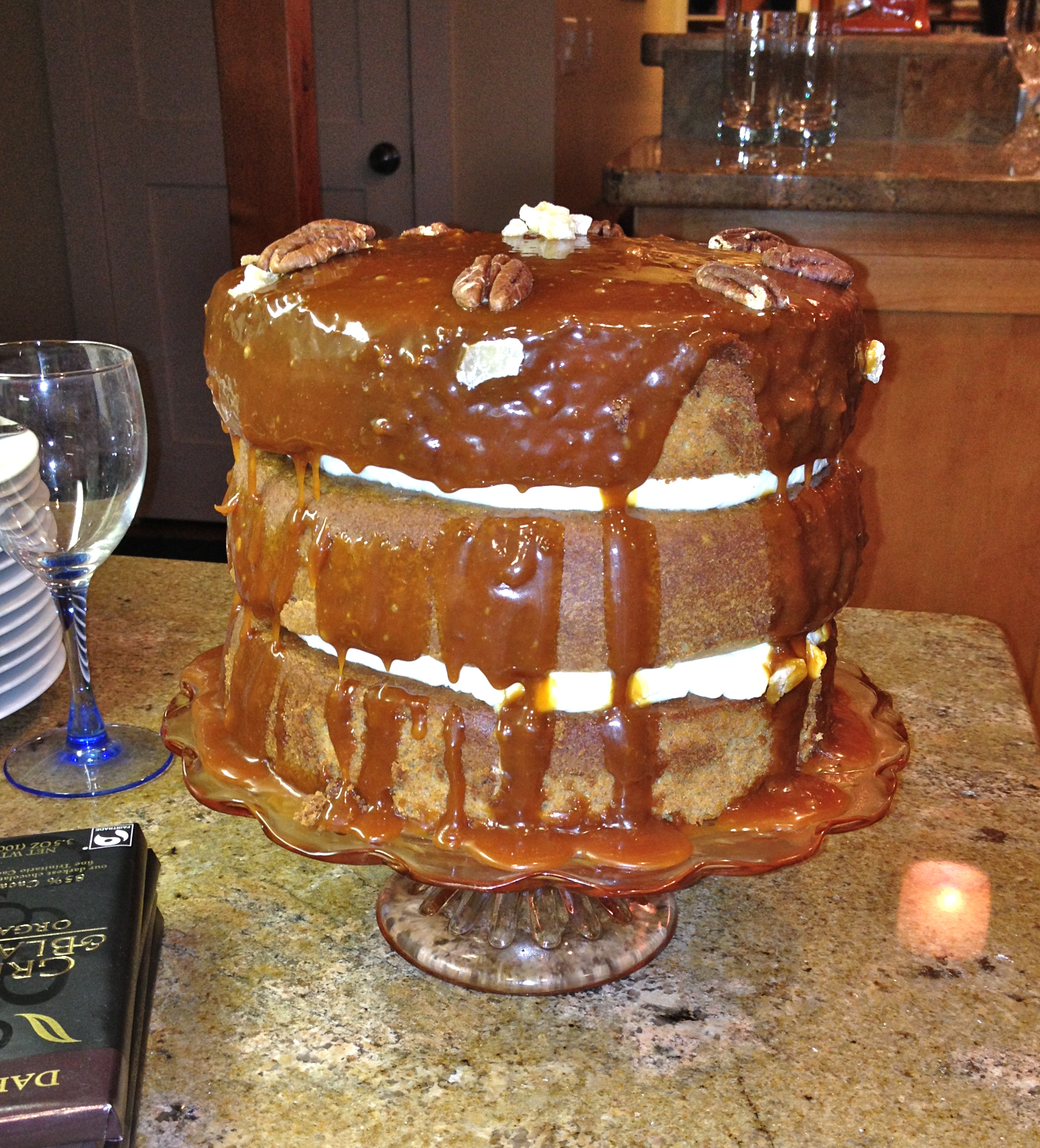 This is the dessert Tara made, a three-layer spice cake with salted caramel glaze and pecans (yup):