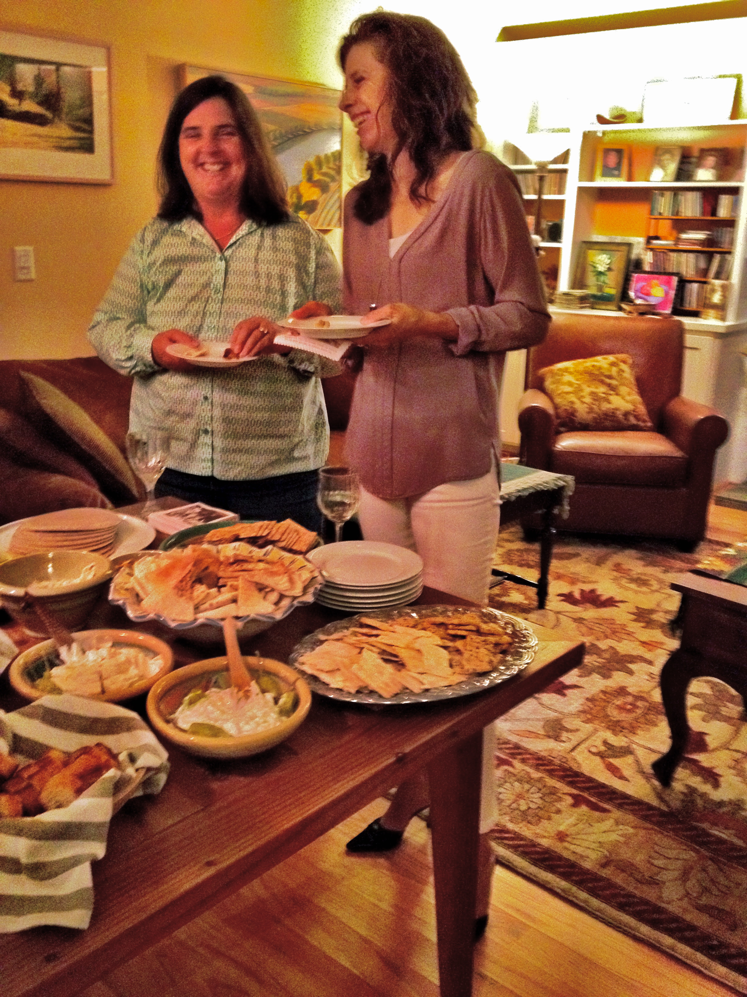 Here are Margie and Tara and the appetizers… cheeses, bread, crackers, olives, nuts, taramosalata, tzadziki and baba ghanoush: