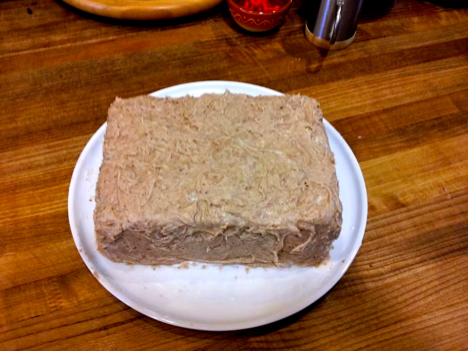After a Facebook query, Jim got some suggestions and commenced to repair the damage this morning. First, he removed all the frosting, then shaved off enough of the cake to make the top and bottom layers flat. In the meantime, he’d made a batch of thin butter cream frosting to use as both mortar and a primer coat of sorts. He smeared a layer onto the bottom and re-stacked the second sheet, then covered the whole thing in a thin layer of his thinned-down frosting. He then stirred the old frosting together with all the bits of chocolate cake that had adhered to it during its removal, and created a new batch of coffee-colored frosting with cake bits embedded. This he spread all over the re-formed cake.