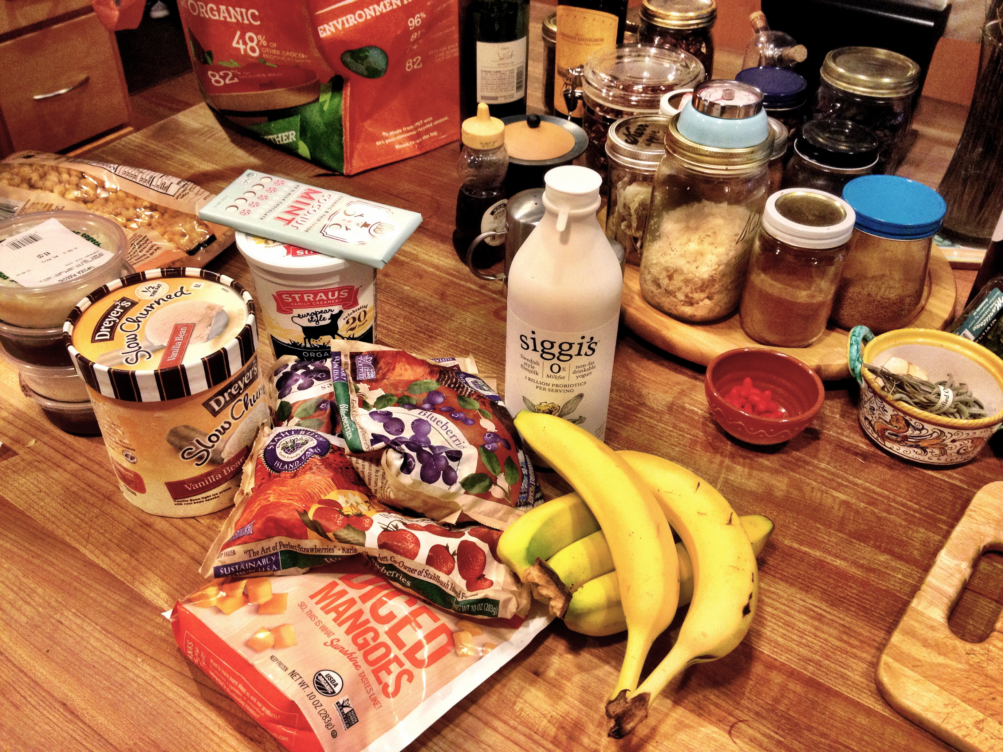 Frozen fruits and bananas for smoothies, vanilla yogurt, vanilla filmjolk (Swedish drinkable yogurt, sorta like kefir), tapioca, chocolate pudding… and candy bars for the caregiver.  (Kidding; he needs no caregiver, but gingerbread chocolate bars and coconut mint chocolate bars? Oh yes.)