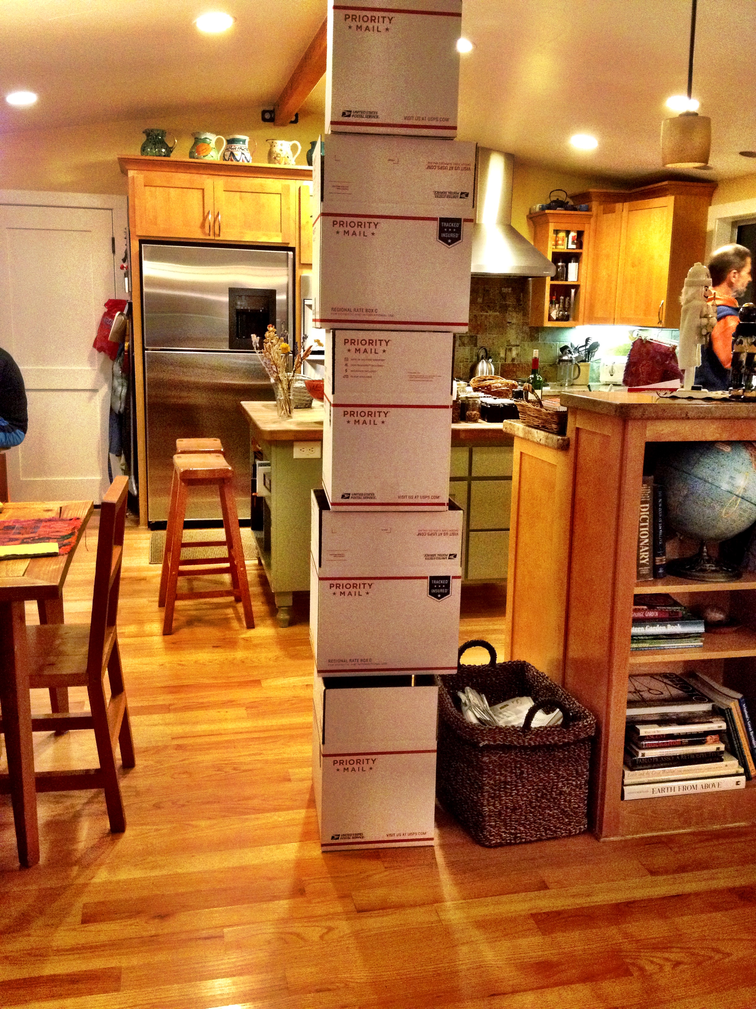 They got shipped to Idaho, Arizona, Montana, and Palos Verdes and we’ll hand carry one to Oakland. Jim does a great job of constructing the boxes, packing and weighing each package, and printing out the address labels and postage stickers. I’d wither at that set of tasks, so very glad to hand that off.