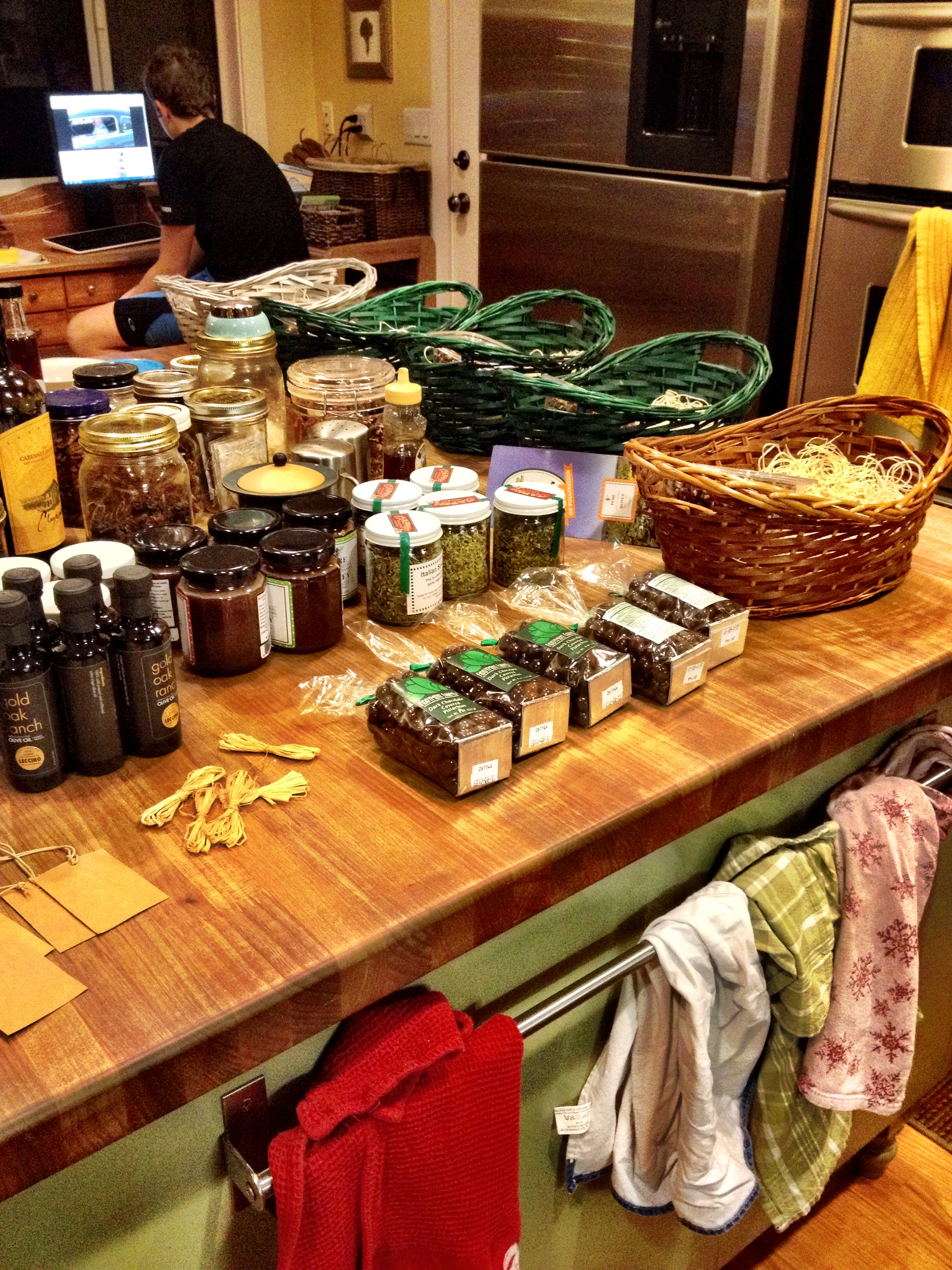So this year it was: Olive oil, pomegranate jam, jalepeno honey, red walnuts (a bitter-free walnut developed by a guy at UC Davis), a wonderful savory herb mix, and chocolate covered pistachios. I would totally love this basket.