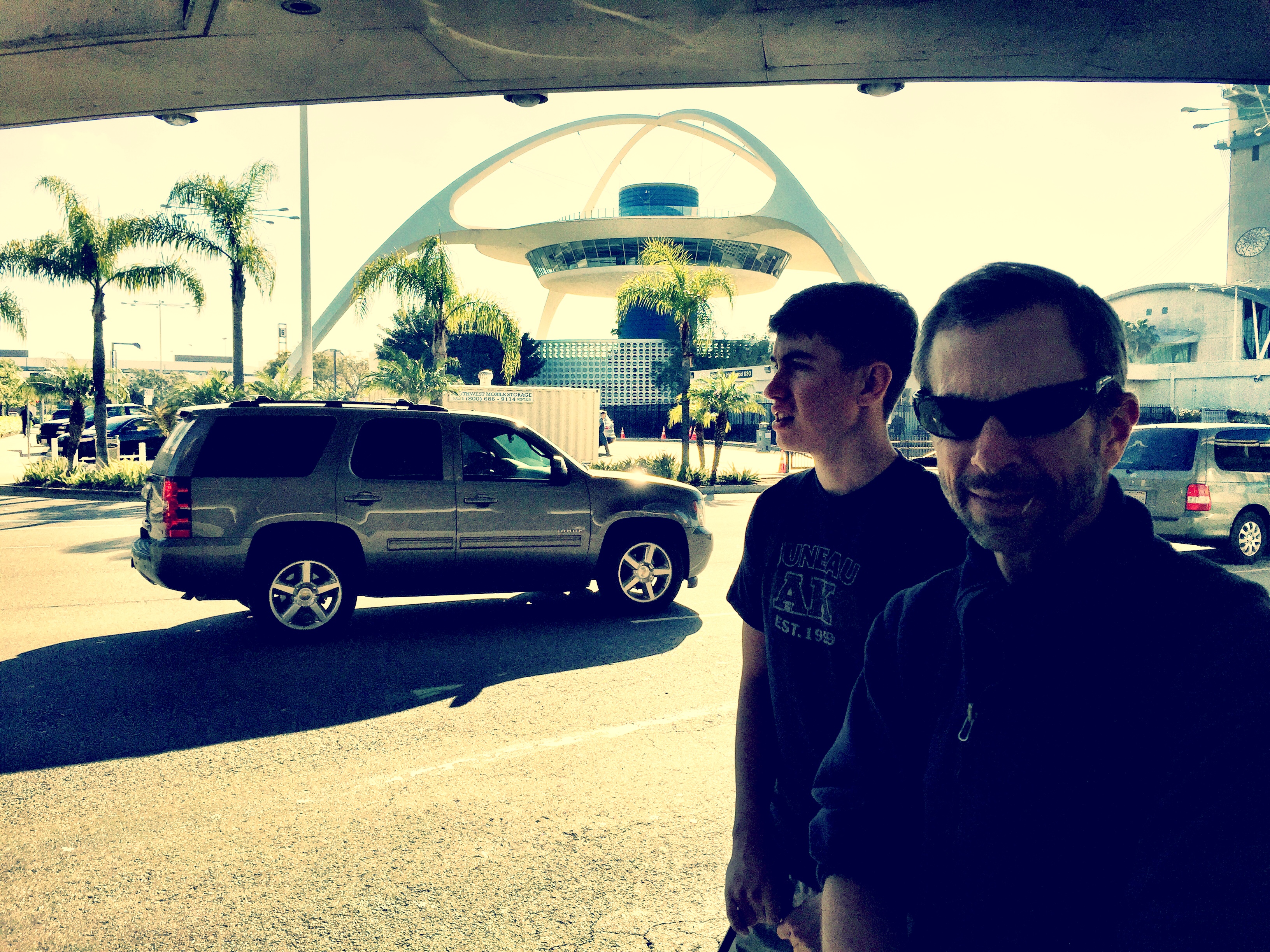 While we waited FORTY-FIVE MINUTES for the Fox Rental Car shuttle to show up…. got a shot of the iconic Theme Building, which I think is closed at the moment, maybe in some kind of transition. Have a great memory of eating lunch here with my dad once when I had a couple-hour layover in LA on my way to someplace else… and he introduced me to the Cobb Salad.