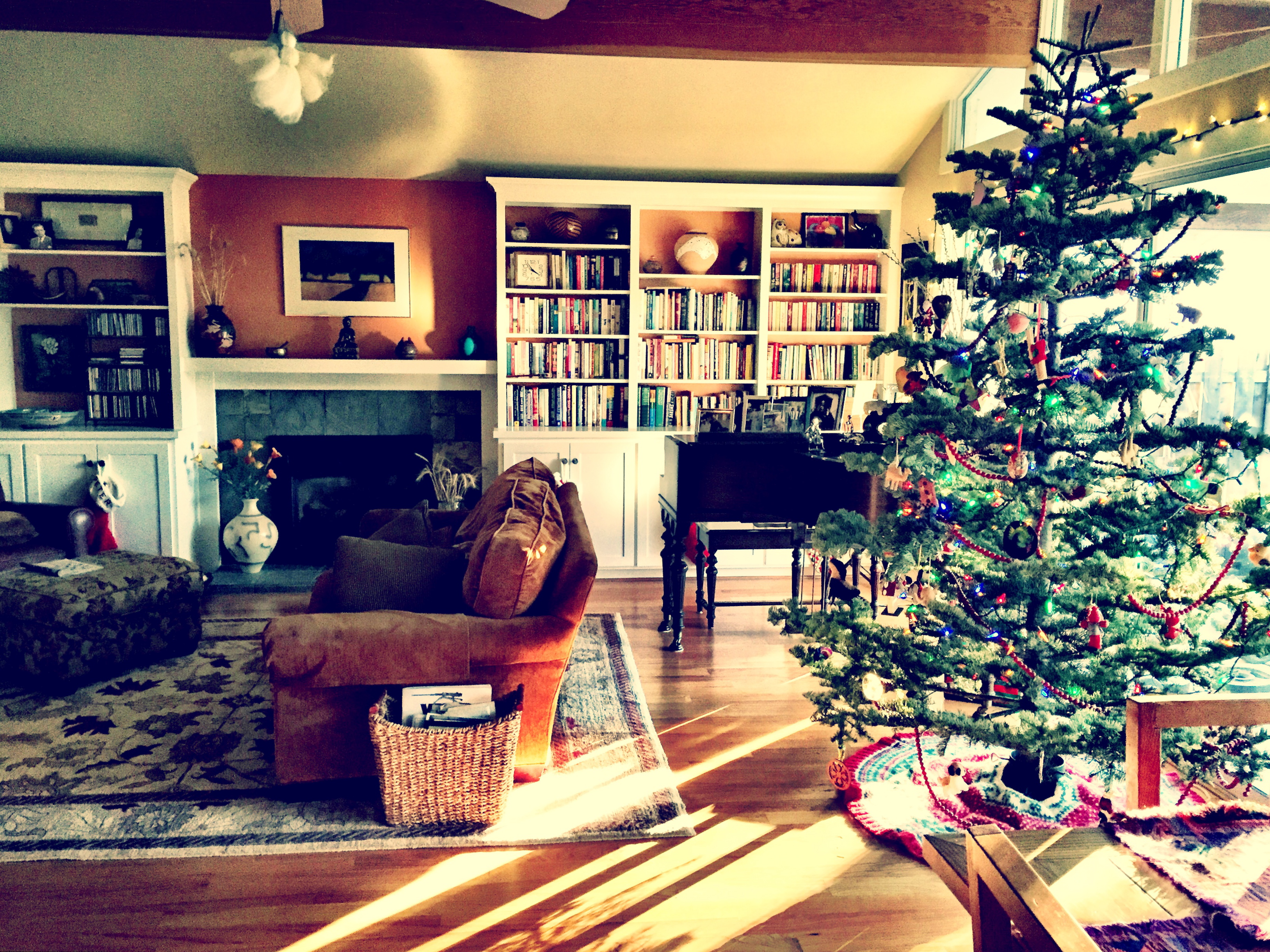 That time of day again… late afternoon, sun streams in, this time illuminating the bookshelf and shining through the lights on the tree, leaving colorful streaks, which are not seen in the photo, but I still love it: