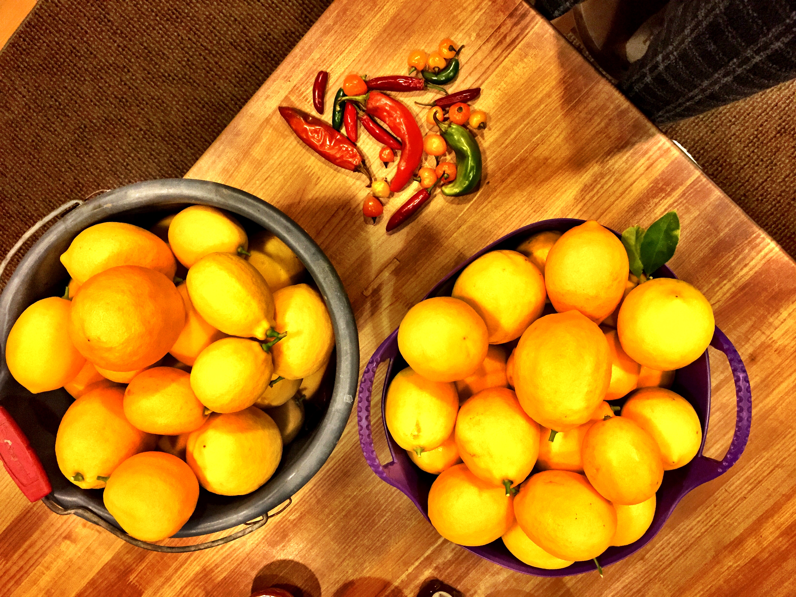 Color shot #1: Harvested what was left of lemons from the front yard Meyer today (I can say that now because we have a backyard Meyer)… two buckets full, plus the final peppers–serranos, habaneros, anaheims: