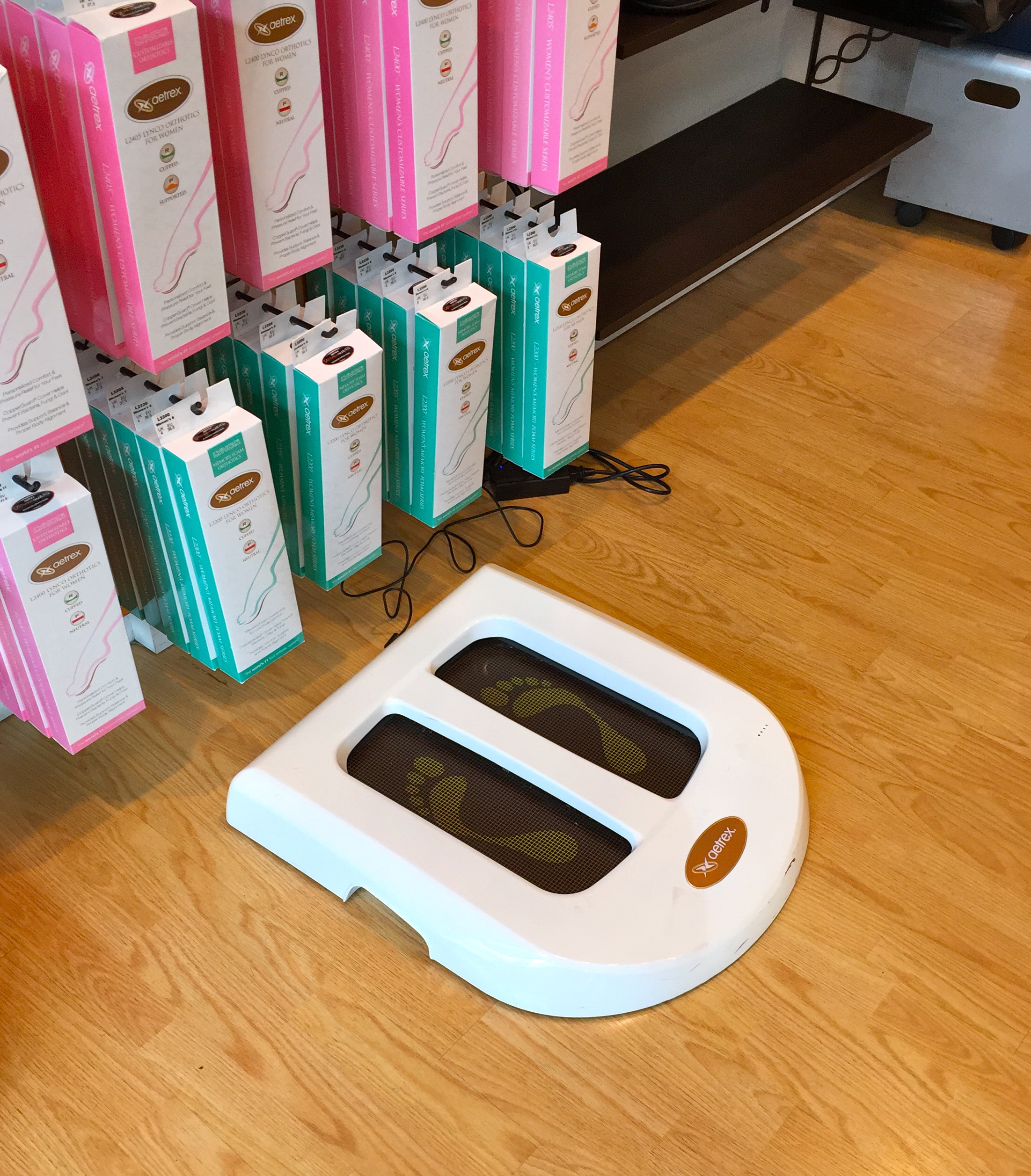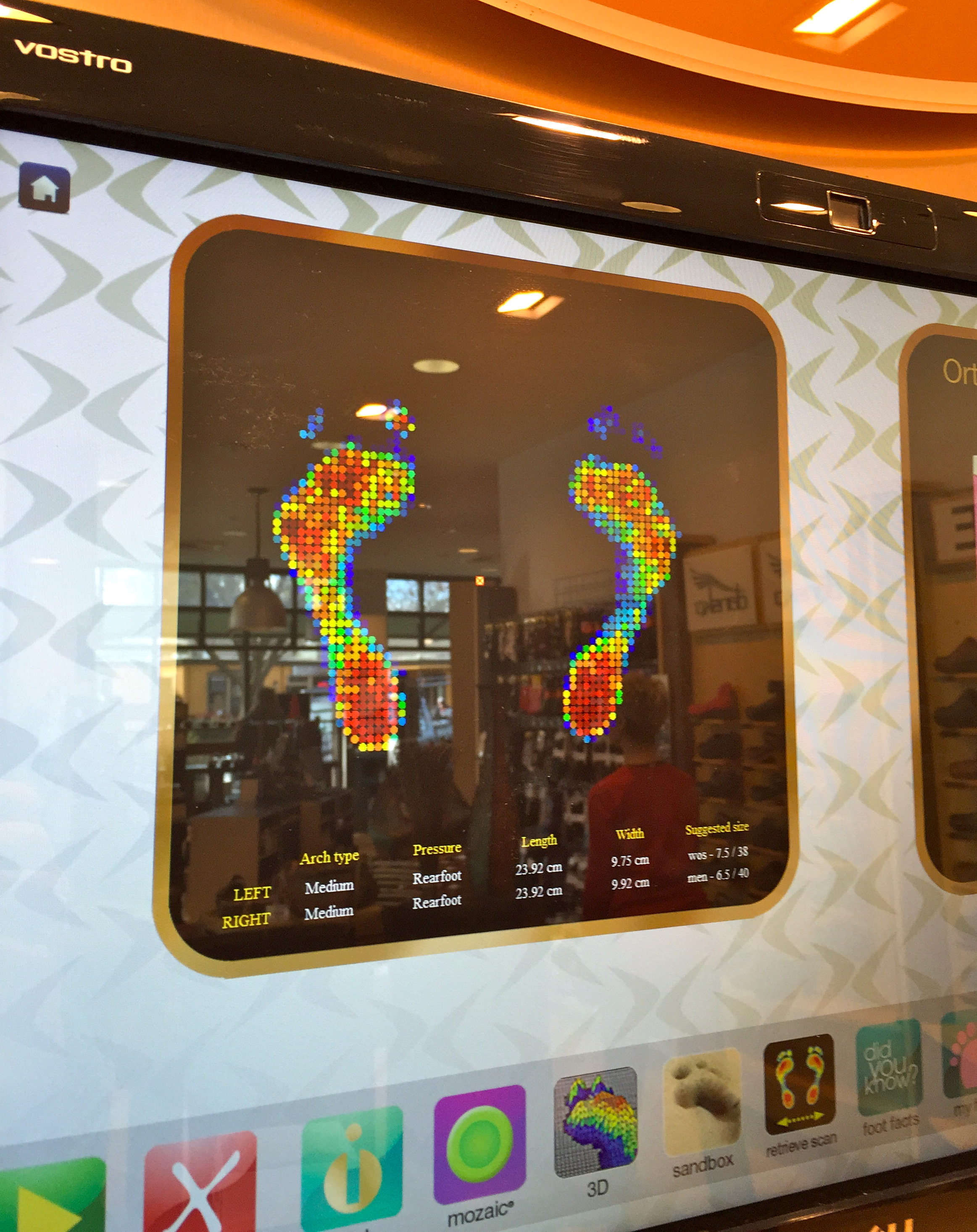 Somebody’s invented the coolest gadget for very precisely measuring not only the length and width of your foot, but also the pressure you apply to various parts of your sole. Like hot spots, which tell them things I cannot even imagine.