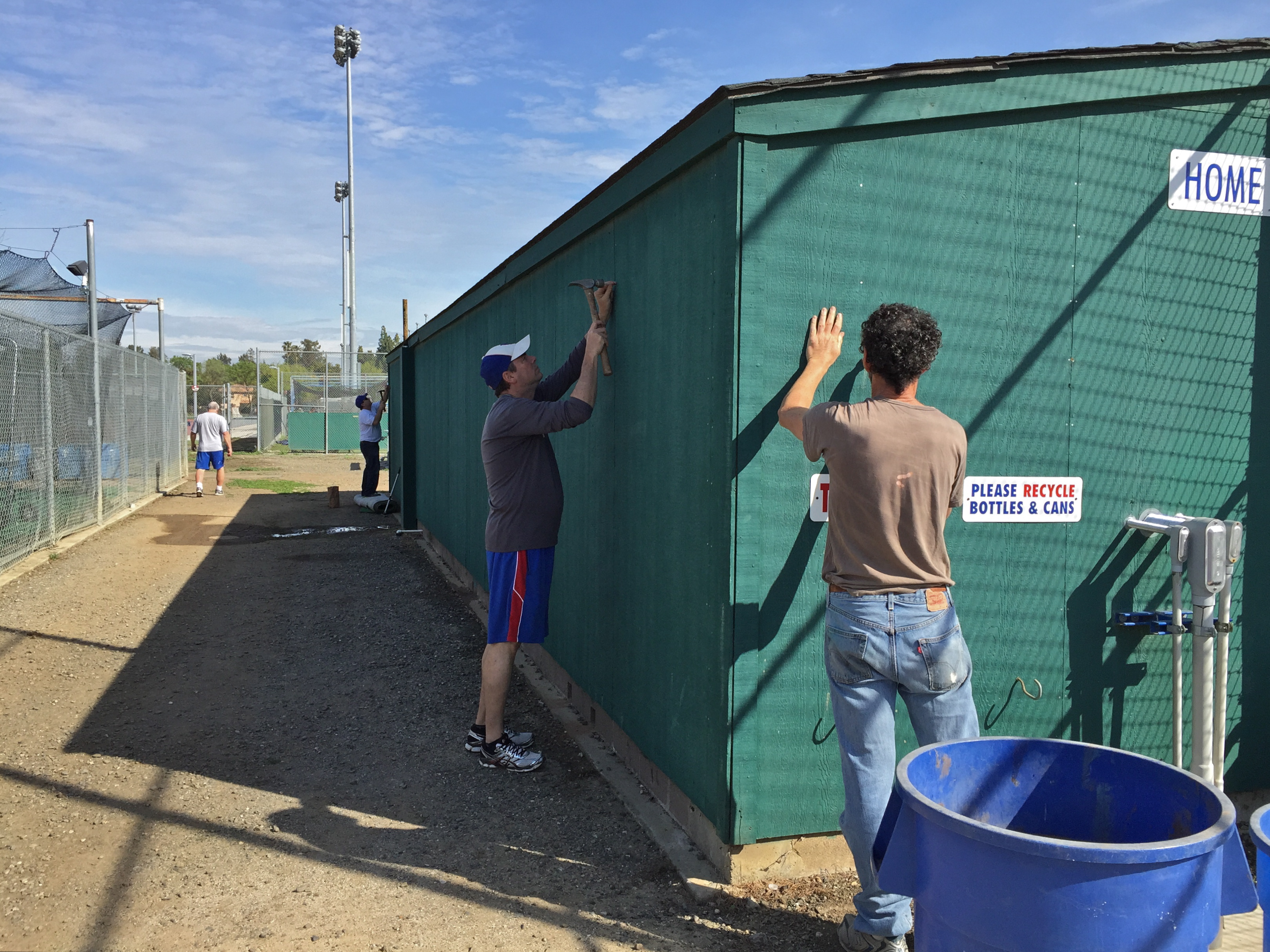 While he was off testing, we were busting our butts at the Varsity Baseball complex at DHS. Annual parent work day. It was actually quite fun and satisfying. Music cranked from the announcer box/snack shack, the clouds gave way to an 81 degree day, and we did back breaking work… hula hoeing weeds, wheelbarrowing around and distributing dirt, hammering dugouts back together, slatting fences, edging base paths. Stuff like that.