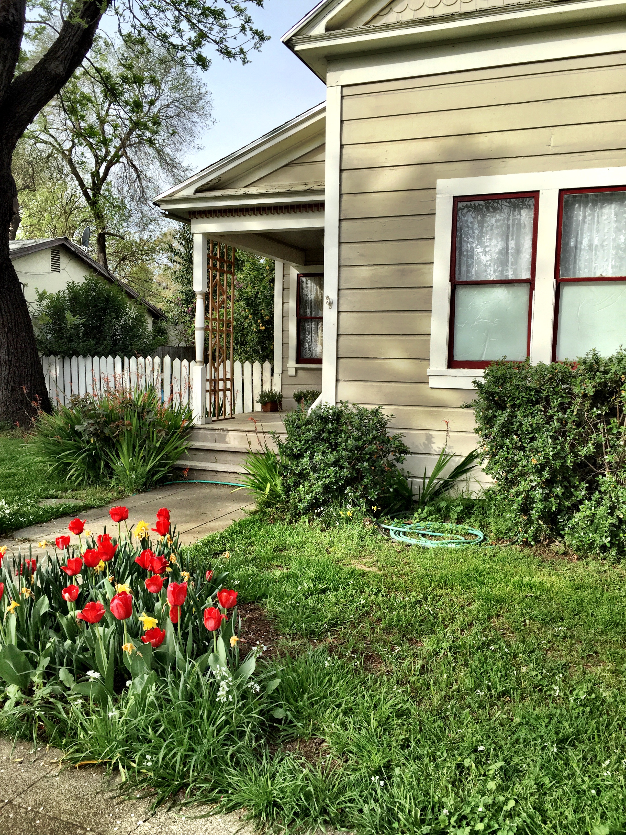 A nice cluster of red tulips with a smattering of daffs on the way to brunch this morning. (And by the way, Bernardo’s is serving up the best corned beef hash I’ve ever eaten. Ever. I’m not kidding. I ordered it without the potatoes (I know, but I just wanted the corned beef). Probably just for the month of March. Consider yourself informed.)