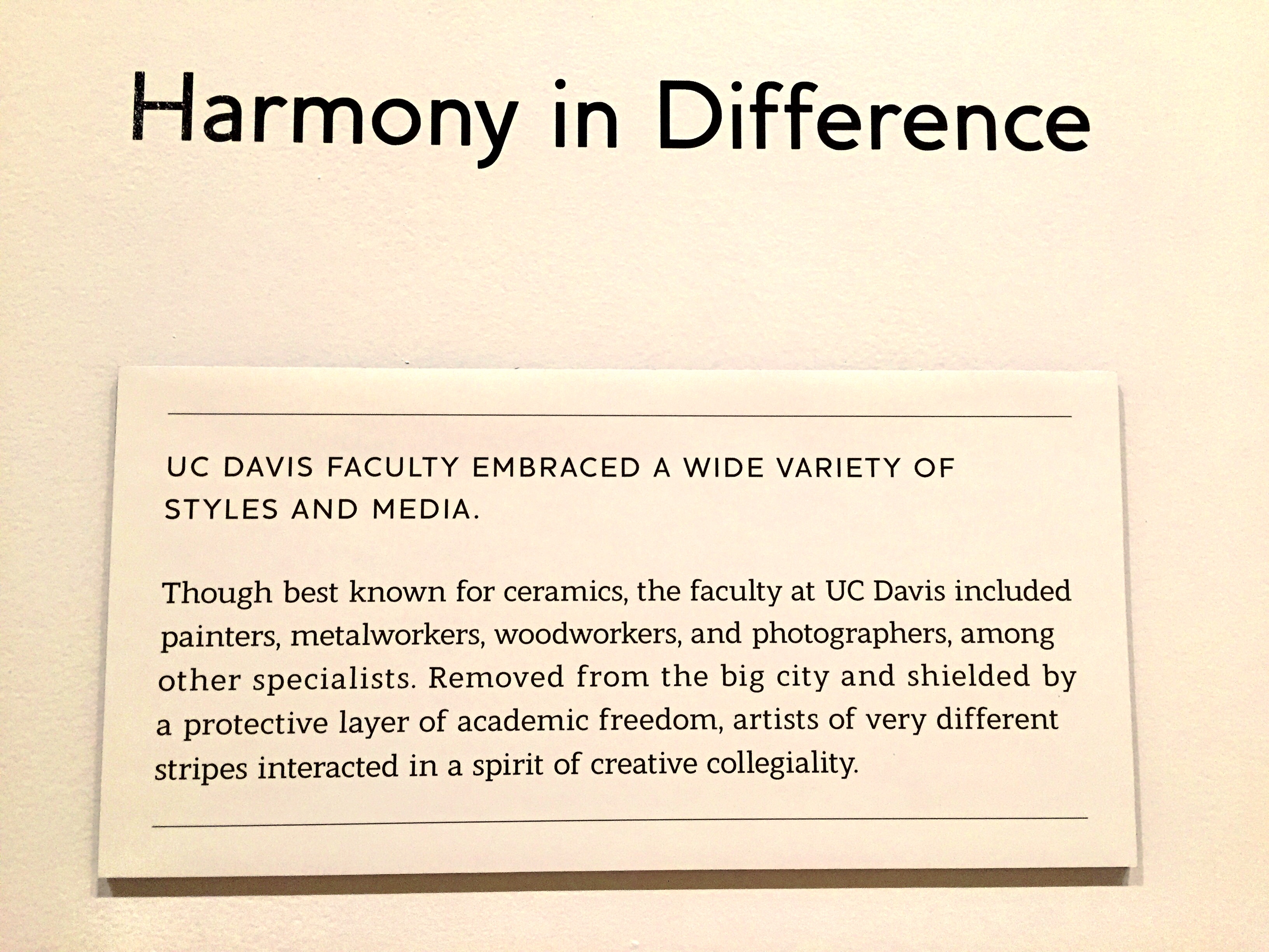This was all about UC Davis in the 60s and 70s. In the opinions of the curators of this exhibit, the then newly-named art department chair Richard L. Nelson showed brilliant leadership in recruiting an eclectic and iconoclastic founding faculty including Robert Arneson, William T. Wiley, Wayne Thiebaud, Manuel Neri and Roy De Forest to whom he gave total artistic freedom to experiment with new forms and ideas.