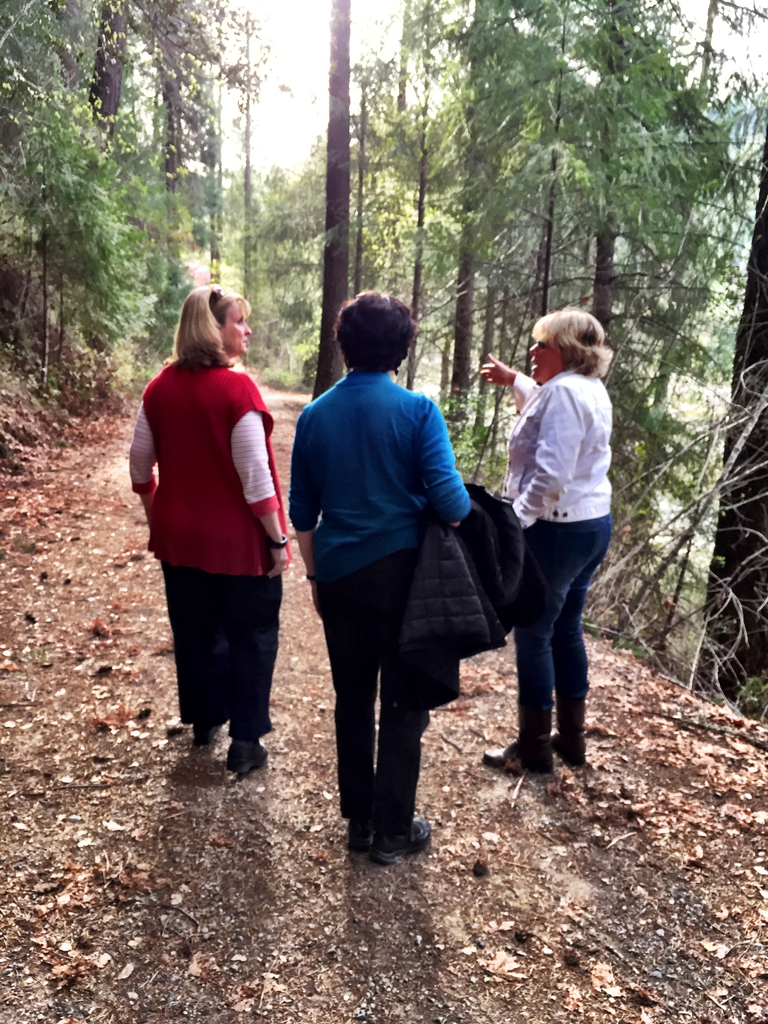 Nancy, Wendy K and Sarah walking along a trail high above the Bear River: