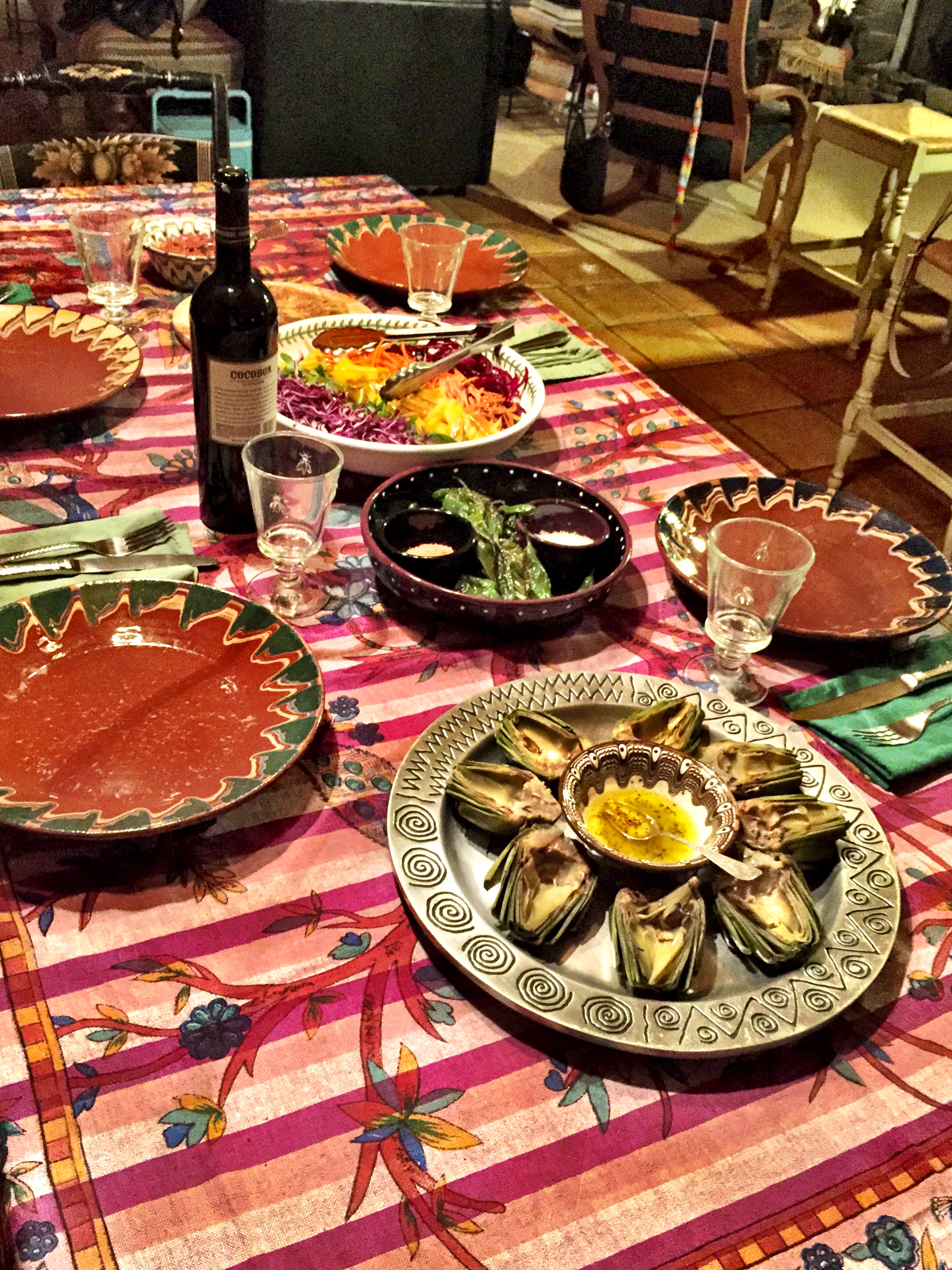 We sat for a long time along the river, talking more and eating the apps I brought. We came back and Sarah laid out this sumptuous dinner spread: grilled artichokes, a beautiful rainbow salad, charred peppers with two salts, spanish tortilla with a rich tomato salsa. Sarah is a gifted chef. Wendy brought a wonderful wine: