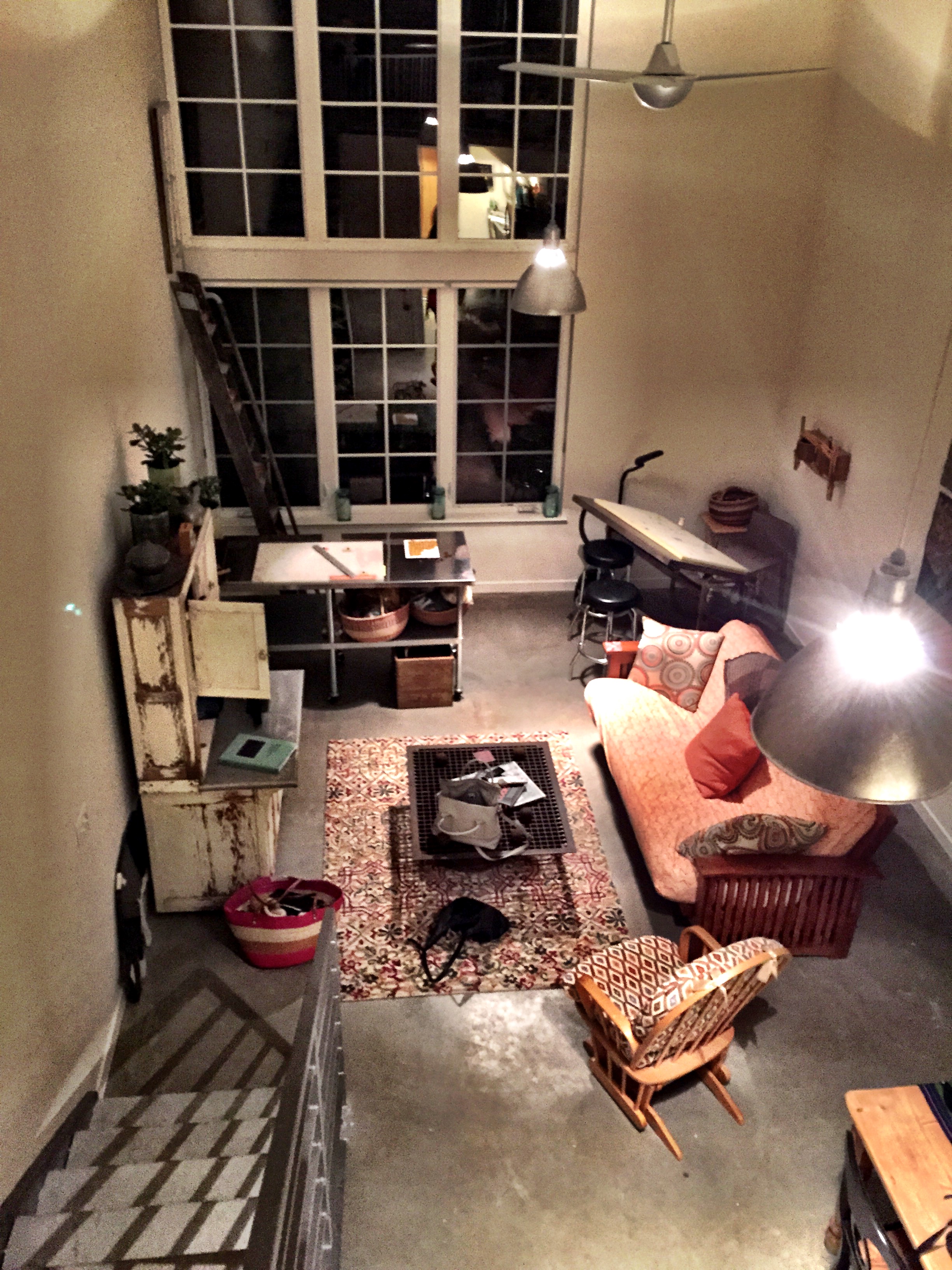 Here’s a shot of the interior of the loft.. note high ceilings, concrete floors, two art tables (making art is a requirement of living there) and stairs leading to bedroom loft, where I’m standing. These lofts just opened a couple of months ago, designed for artists, and works of art are everywhere.