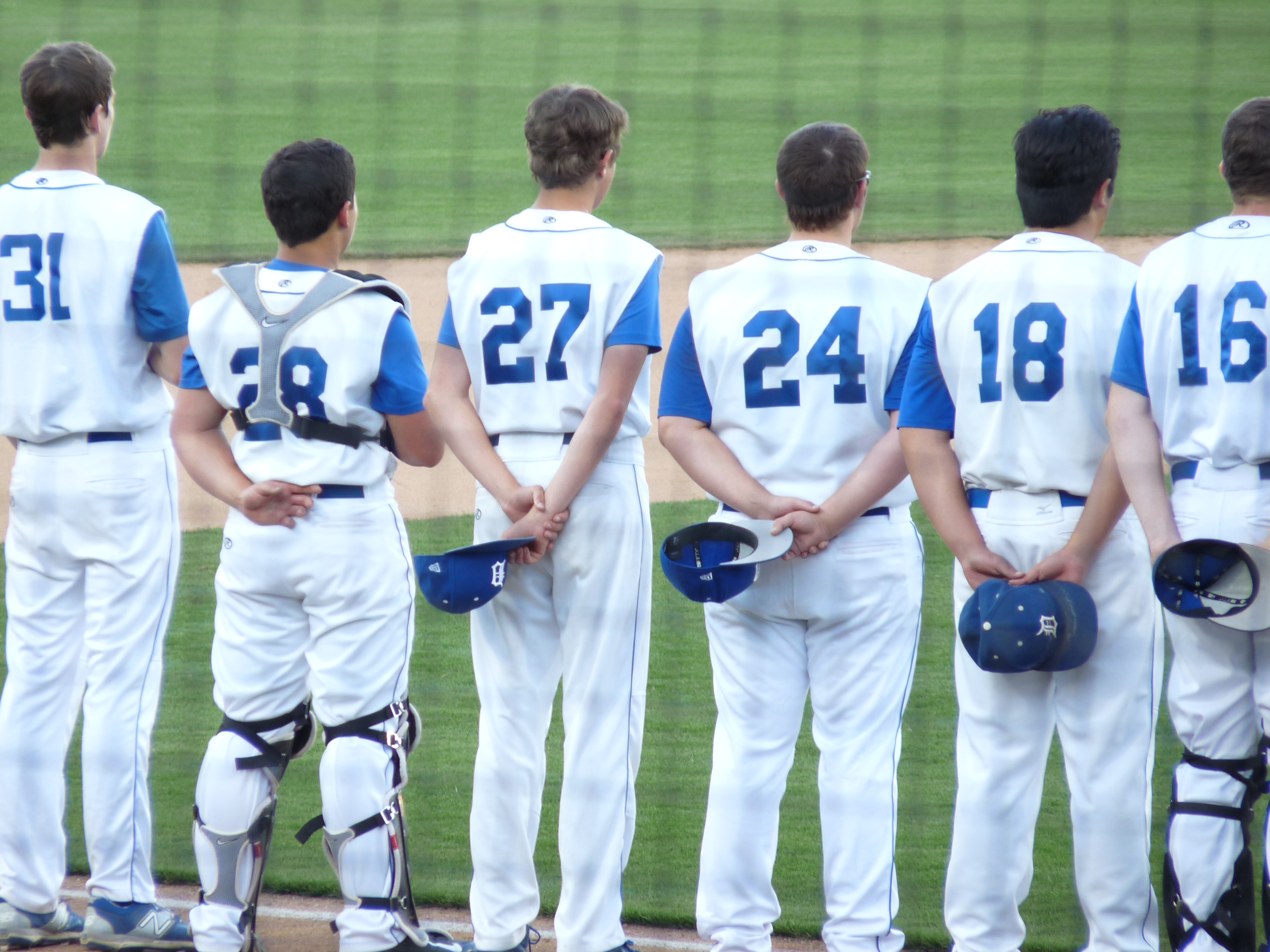 Assembled along the third base line for official game-opening protocol (we brought along our DHS treble choir for the Star-Spangled Banner honors, which made everybody feel right at home). Backsides of: Tyler M (gosh, he’s tall for a freshman..), Mason, Peter, Brendan, Ray and EWalk: