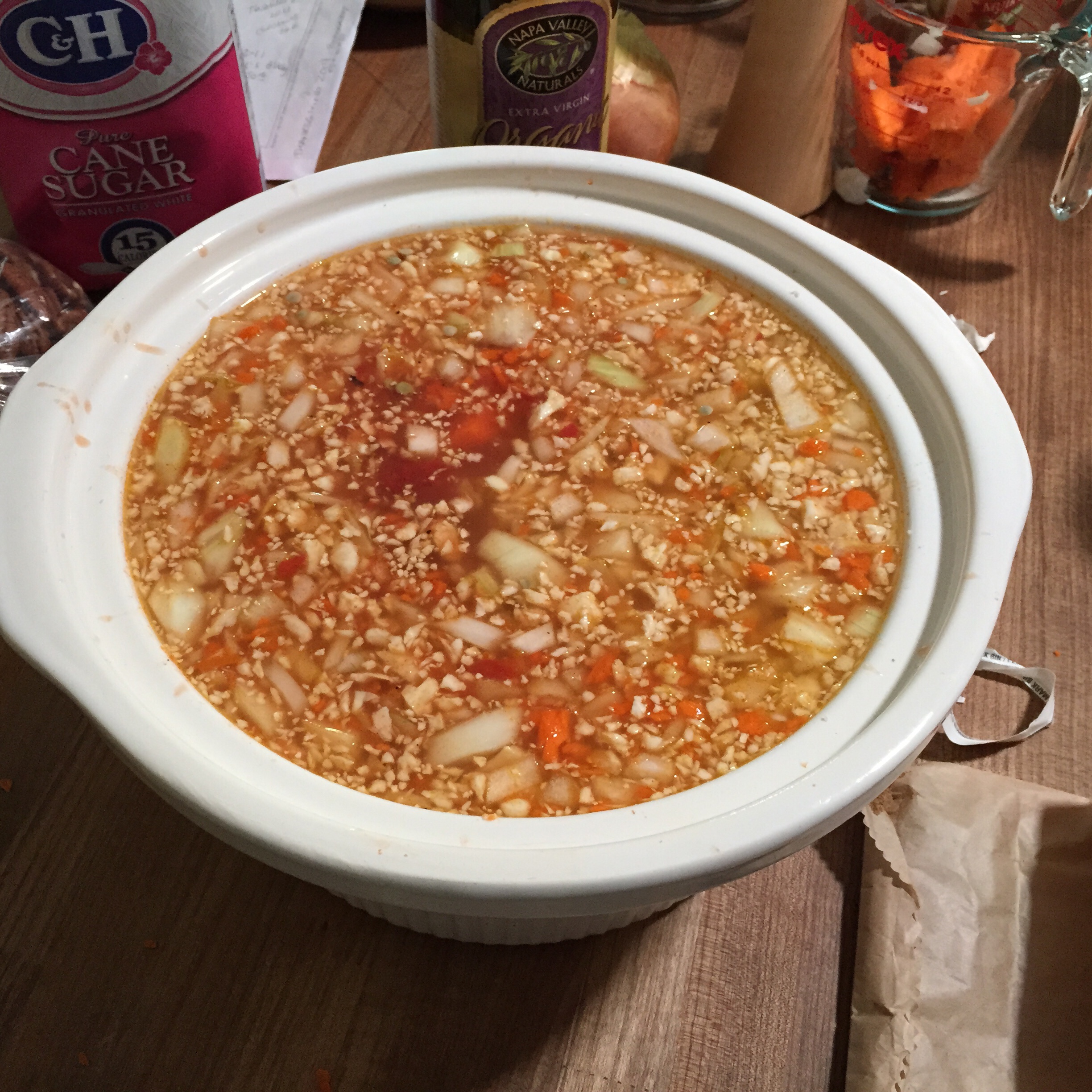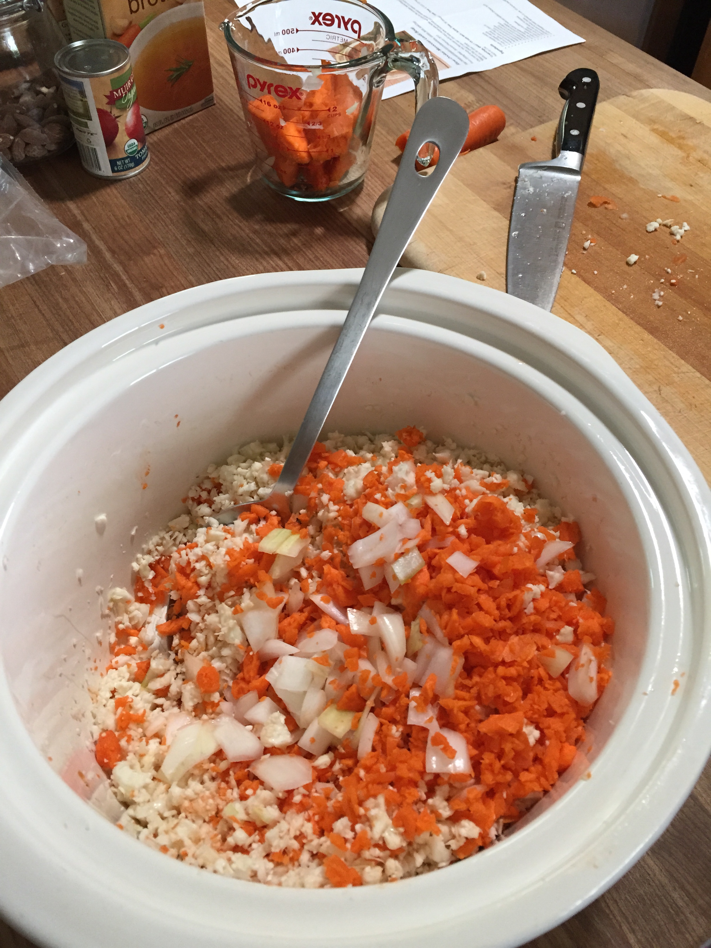 Into the crock pot this afternoon went chopped carrots, onions, and cauliflower..