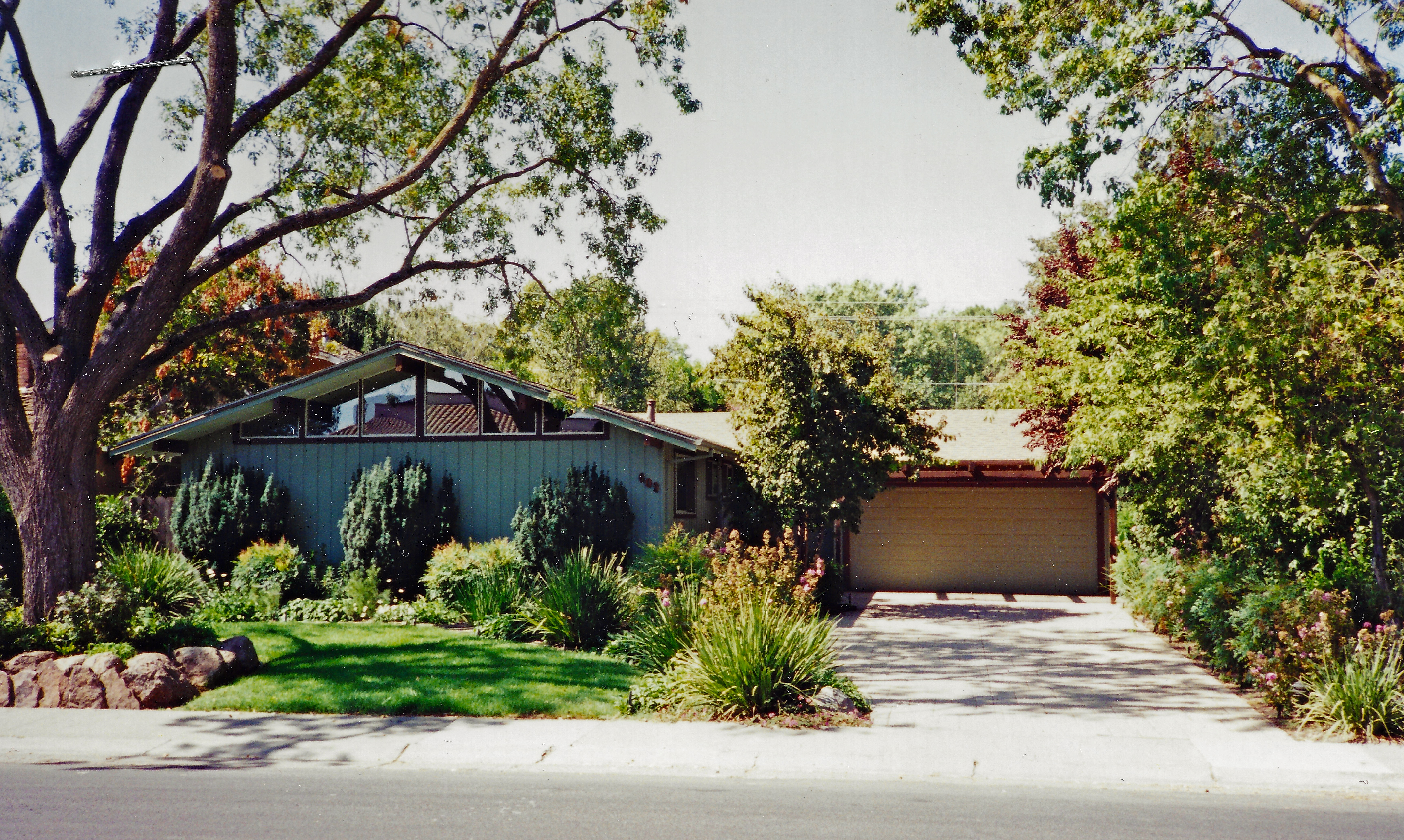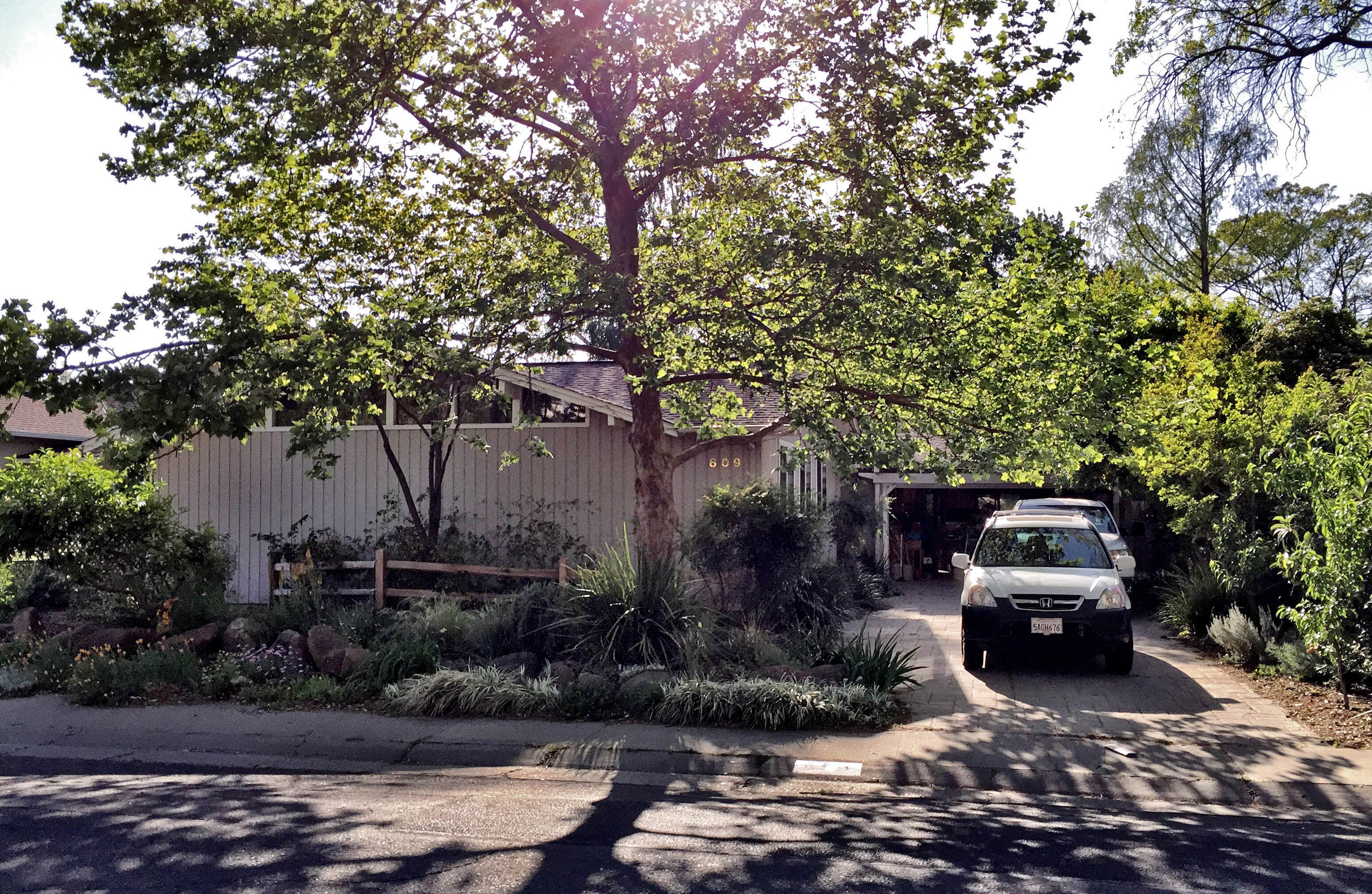 Big Modesto ash in the center, which sat in a large raised boulder-bound bed, a lawn surrounded by shrubs, flowers and three large podocarpus… it was very shady and lovely. (And the house was avocado green!)