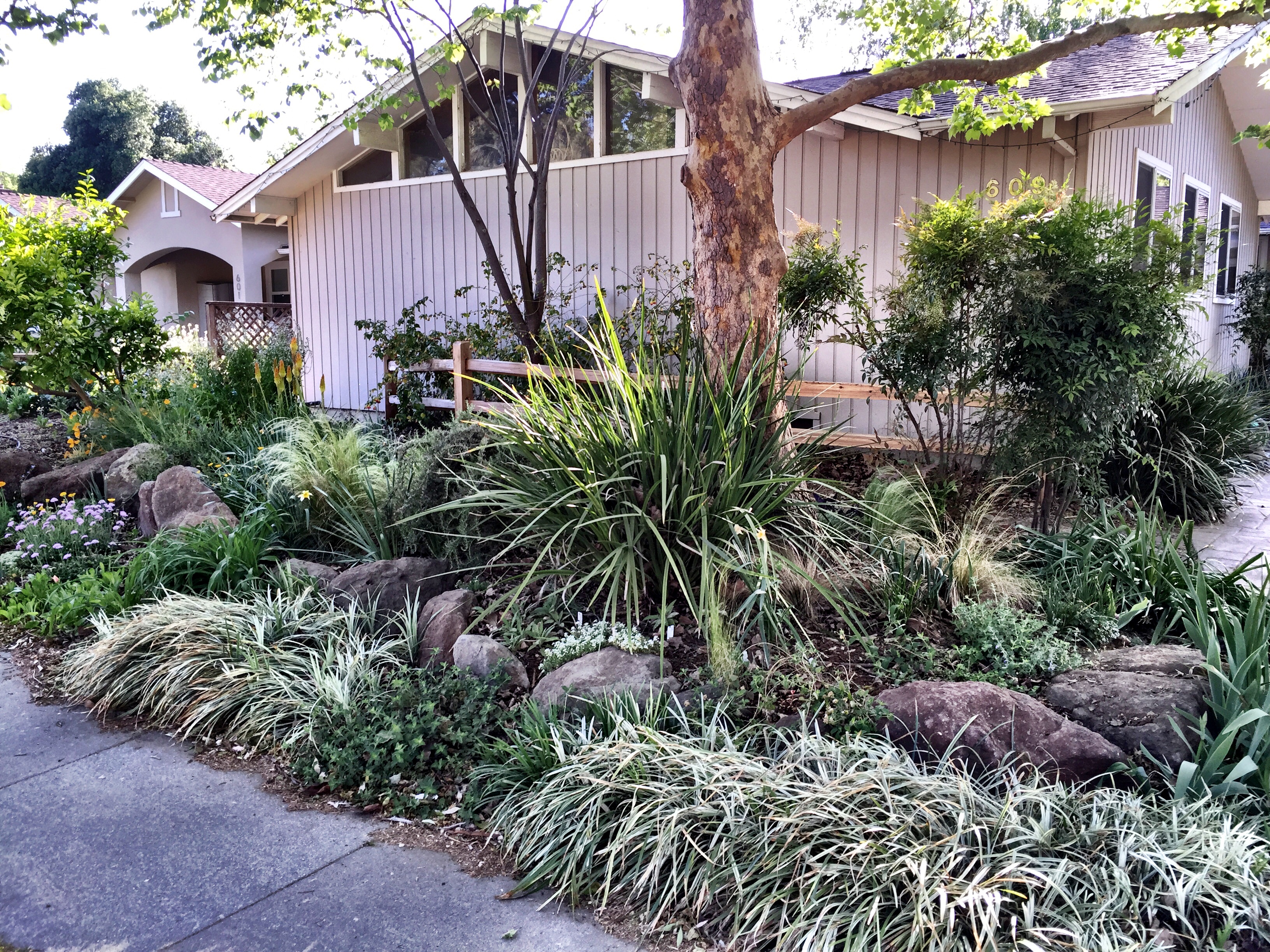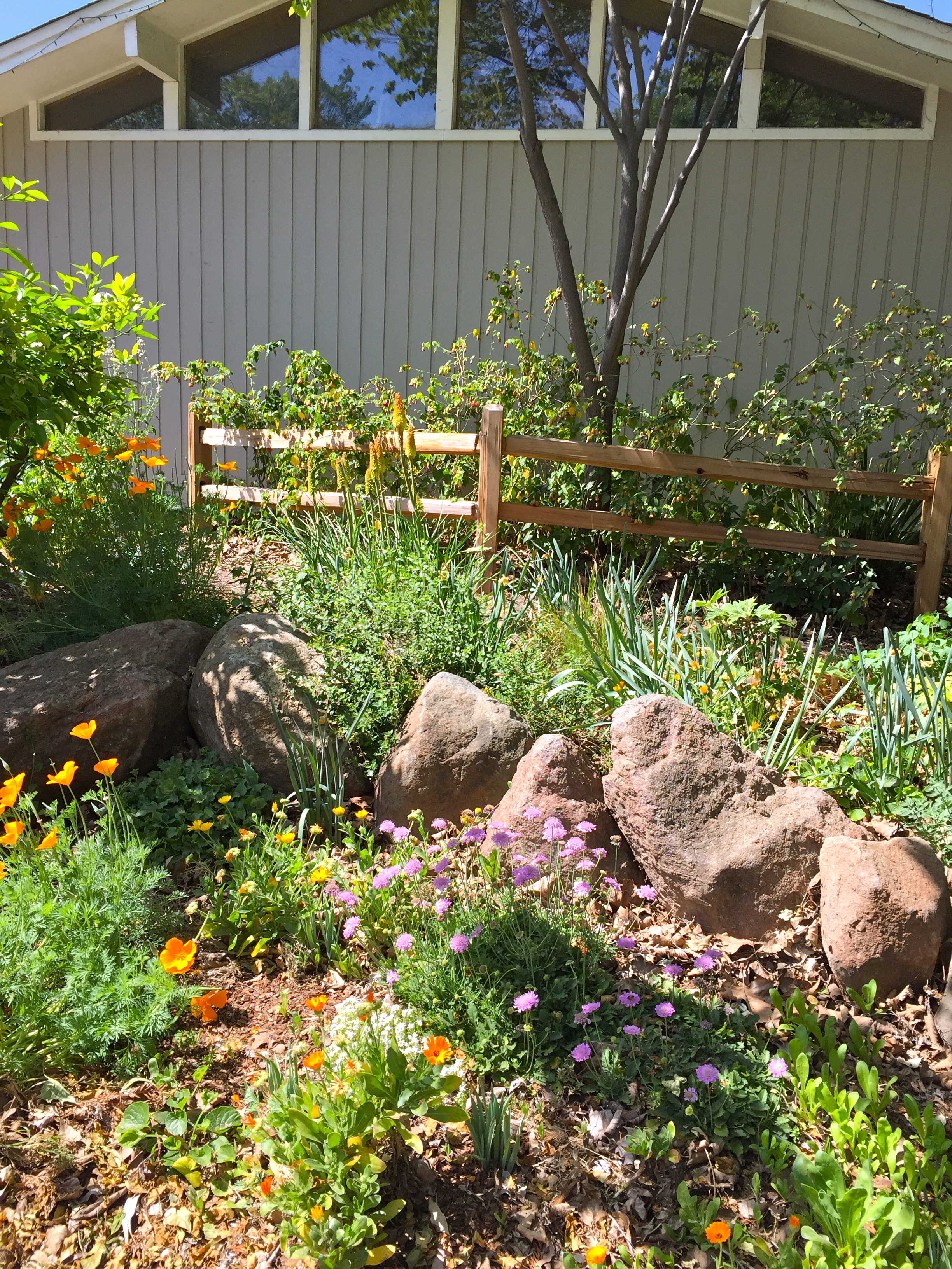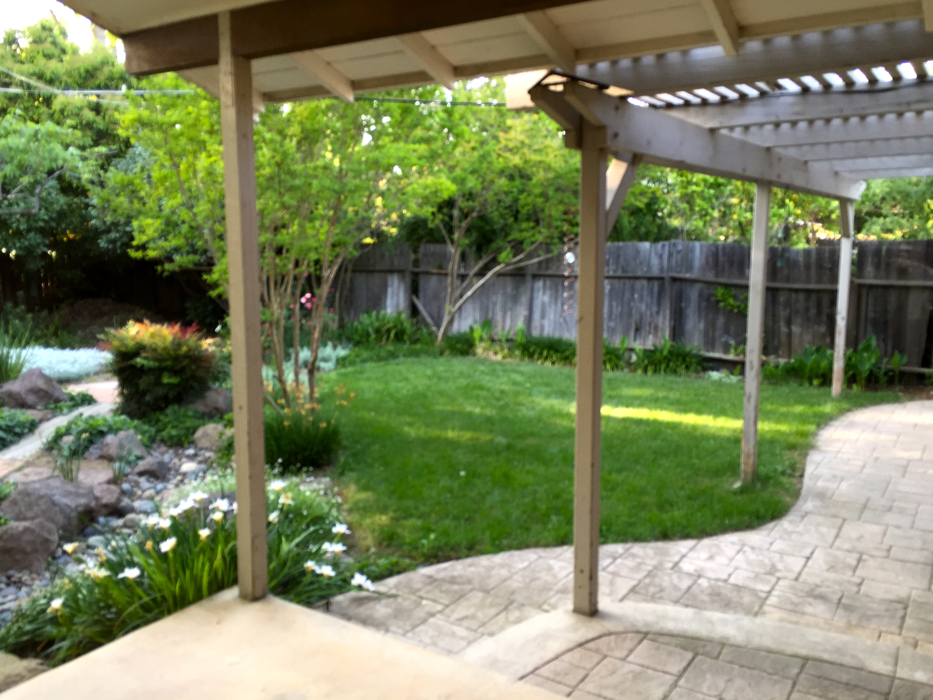 Redwood Bard designed the initial re-vamp. The most enduring feature is the terrace that they created with those boulders. In the years since, we’ve gone through numerous different planting schemes. We’ve had various kinds of gardens, including an extensive vegetable and herb garden. We’ve planted and removed a few trees, too. Now the yard is grassless. It’s STILL a work in progress, but for now looks like this: