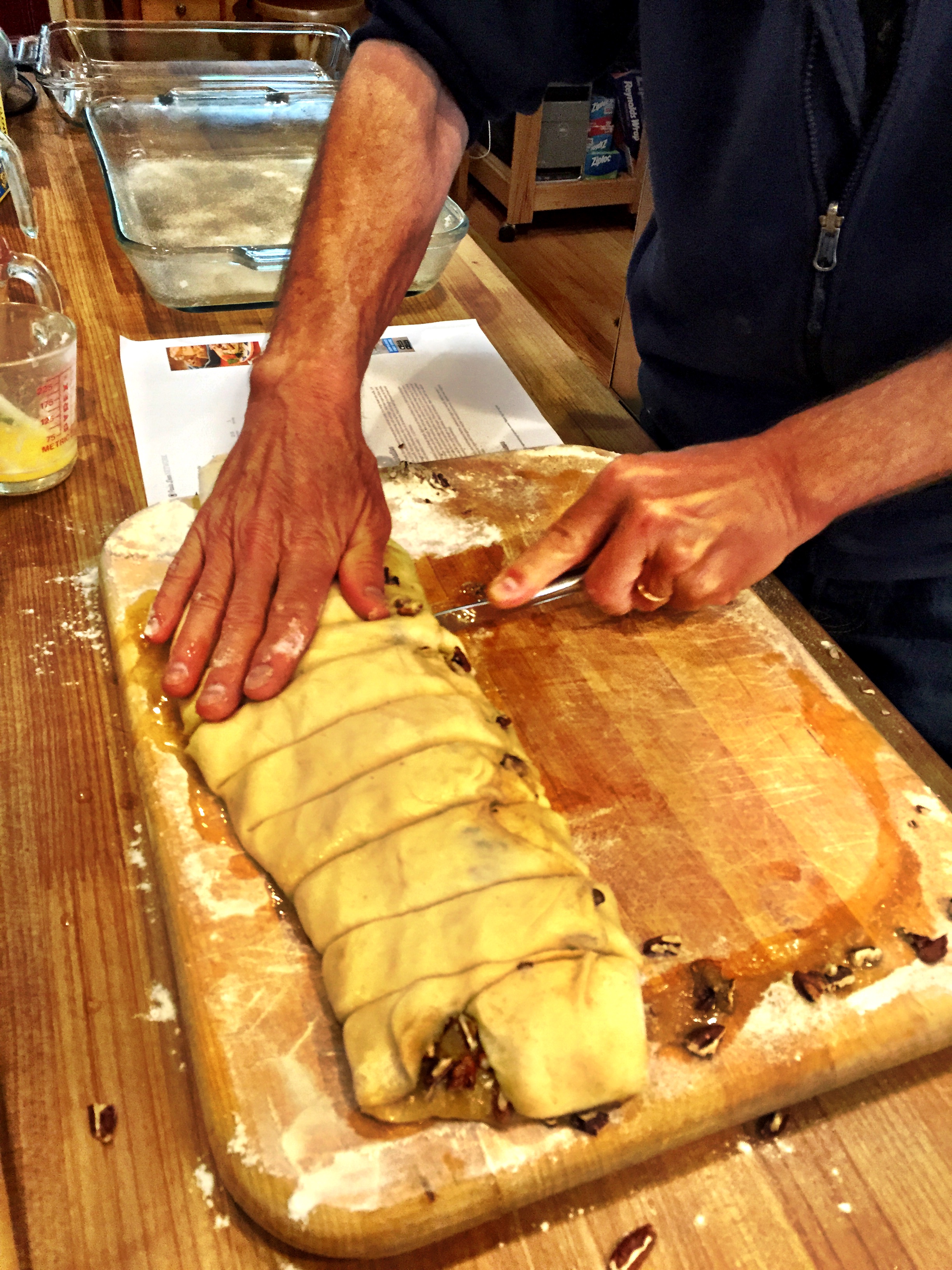 The dough has flour, yeast, egg, cream*, sugar. Here’s Jim kneading it…