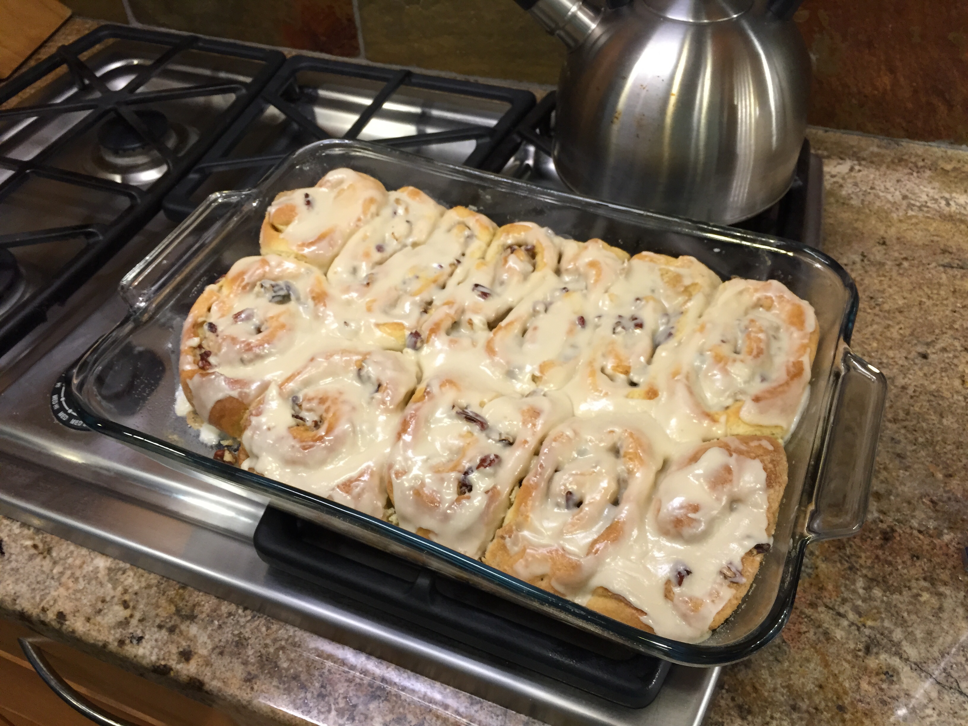 They bake for 30 minutes, until golden brown. When slightly cooled, you spread with a butter & powdered sugar frosting. Done!