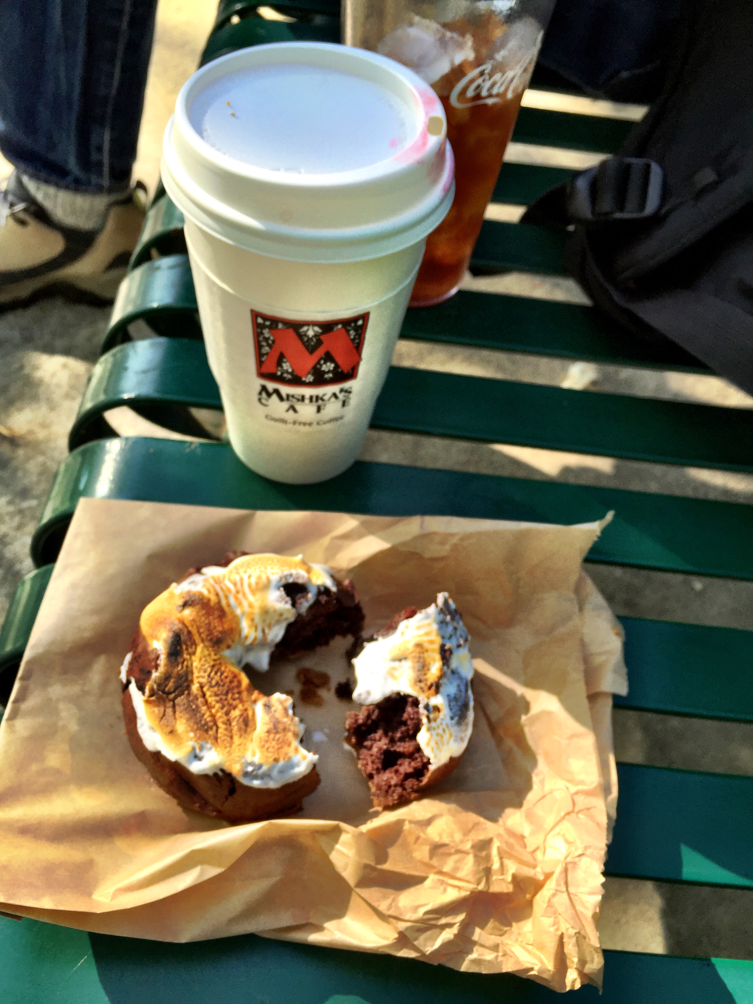 Jim bears off at Crepeville to get his iced tea, and I continue on to Mishka’s to get coffee. We’ll meet back at the park. I’m planning to get a poppyseed muffin (you don’t say), but then see the chocolate donut that Sinisa posted about on Facebook–a weekend-only homemade specialty of theirs–and I get all excited about that, so order it.. before realizing Wait, I don’t have any money I’ll have to come back.