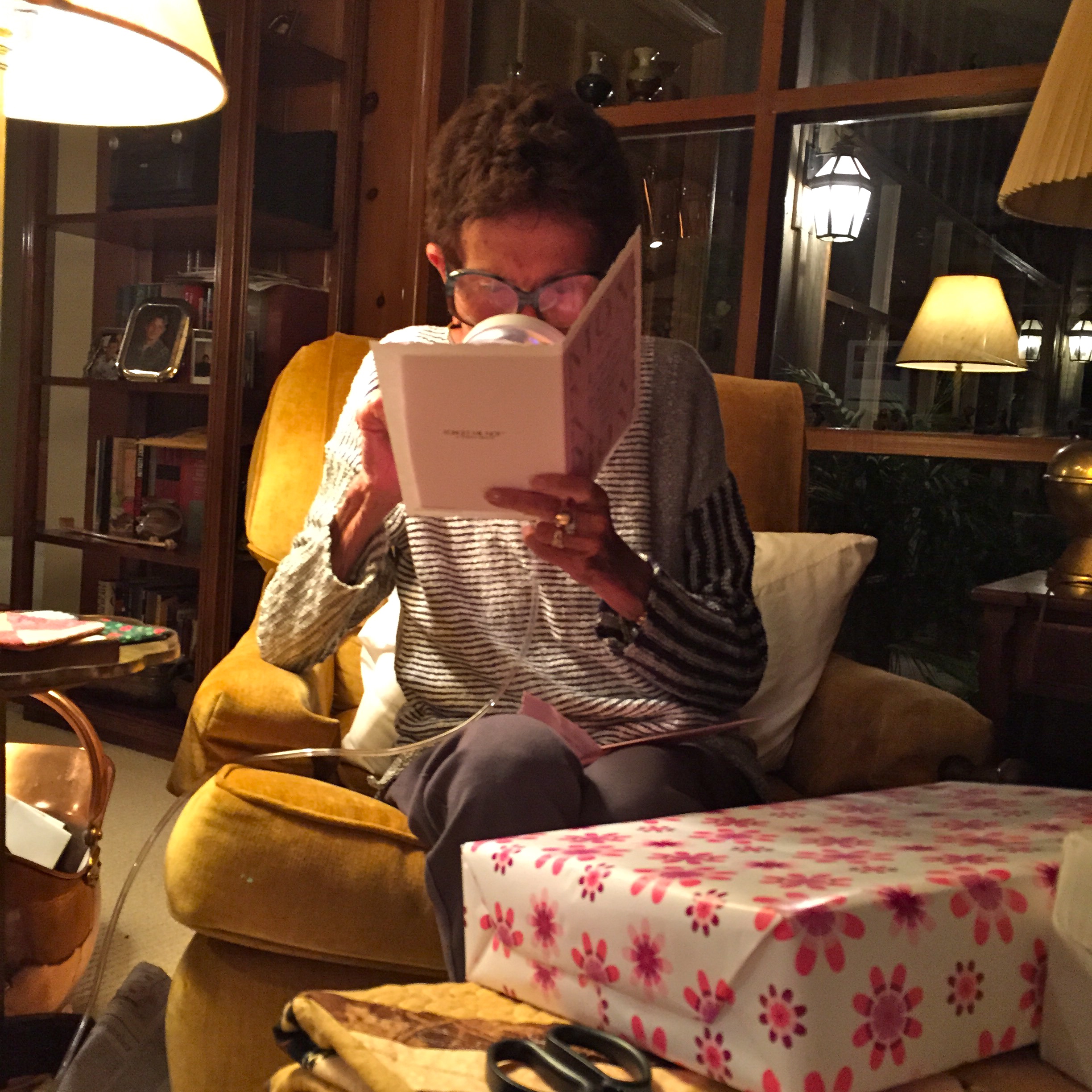 We were treated to some wonderful house desserts (best doughnuts I’ve ever eaten) and then we came home to presents… Mom with magnifying glass to read the cards. Cute, no?