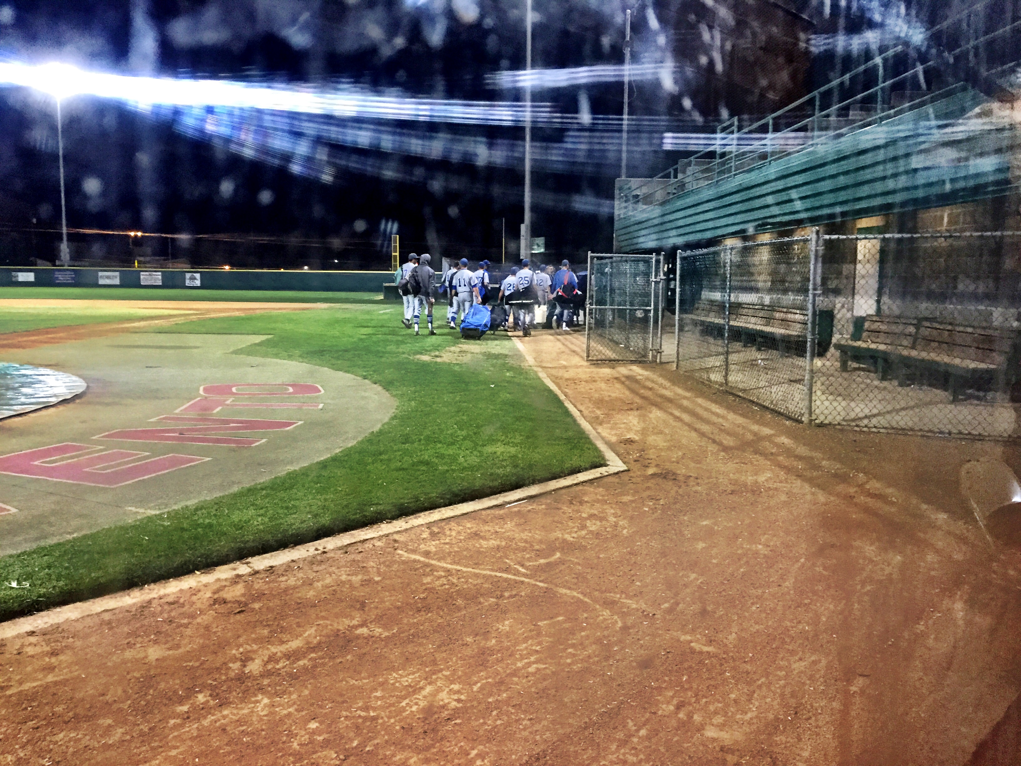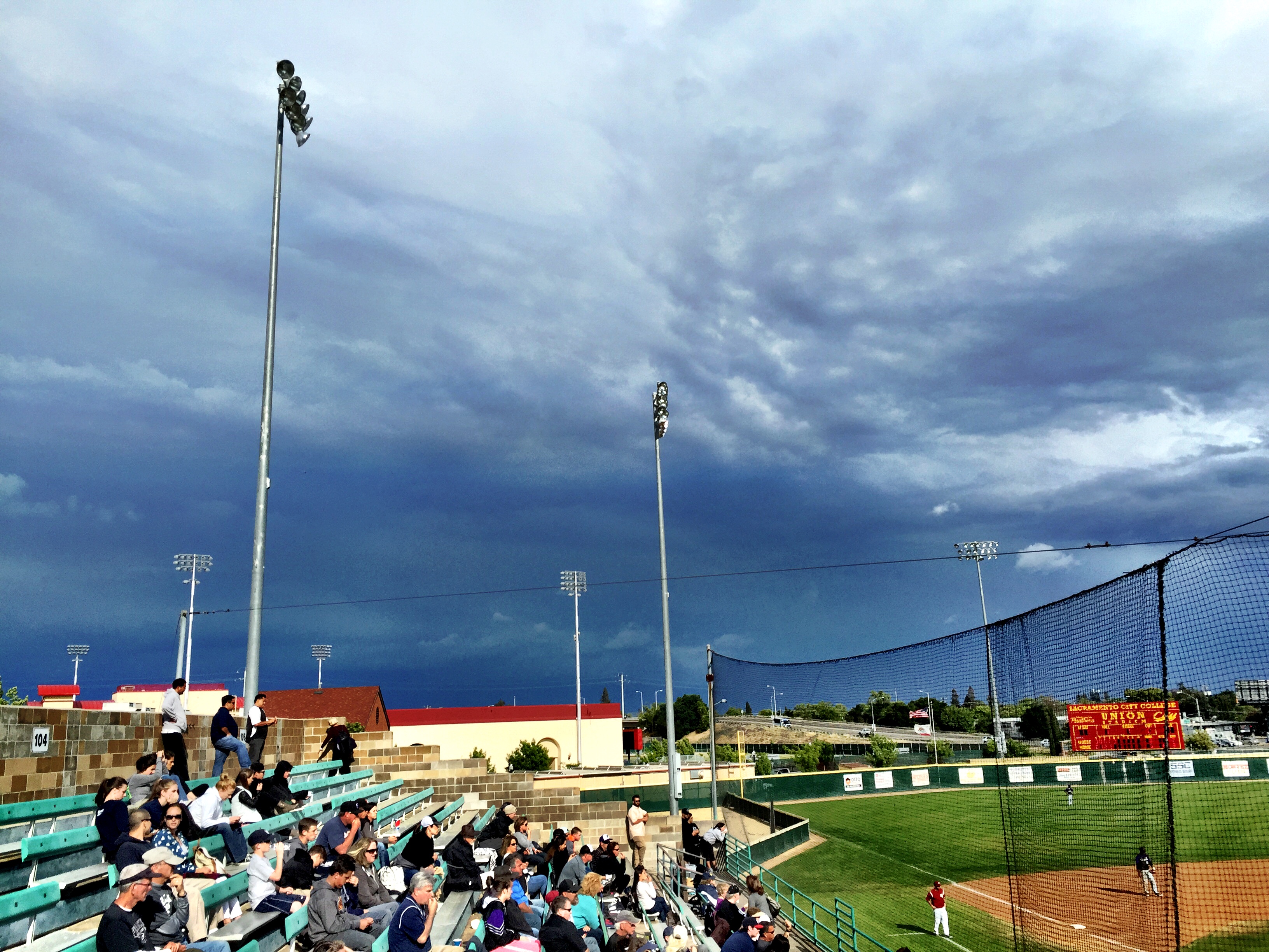 We weren’t even sure we’d have a game tonight, what with a 90% chance of thunderstorms forecast for 7:00pm–the scheduled start of the game. This is the ominous, foreboding sky just before our players took the field.