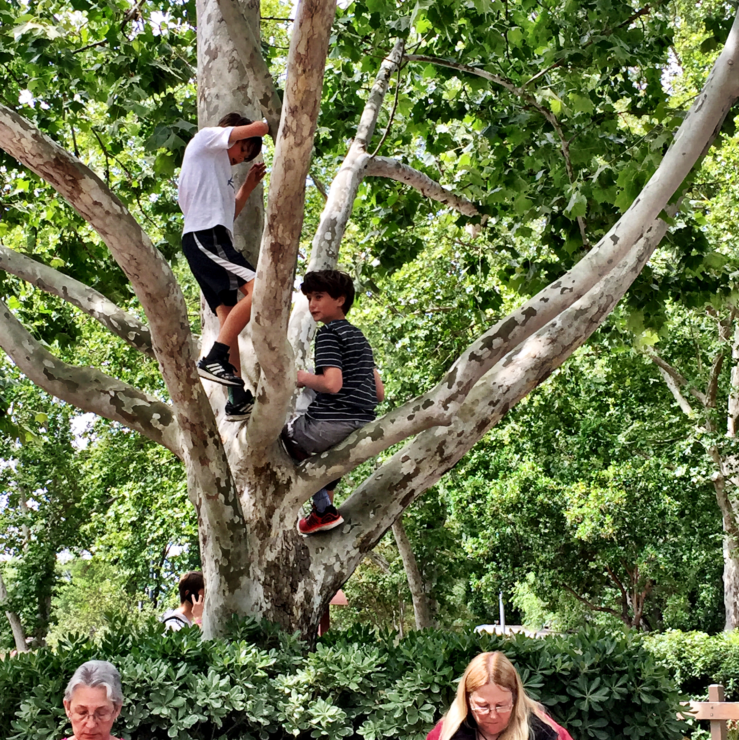 There was the usual loveliness of time spent on a bench in the plaza at Central Park during the Farmer’s Market, drinking our respective caffeinated drinks, shooting the breeze with people we know.. while watching these guys in an adjacent sycamore tree: