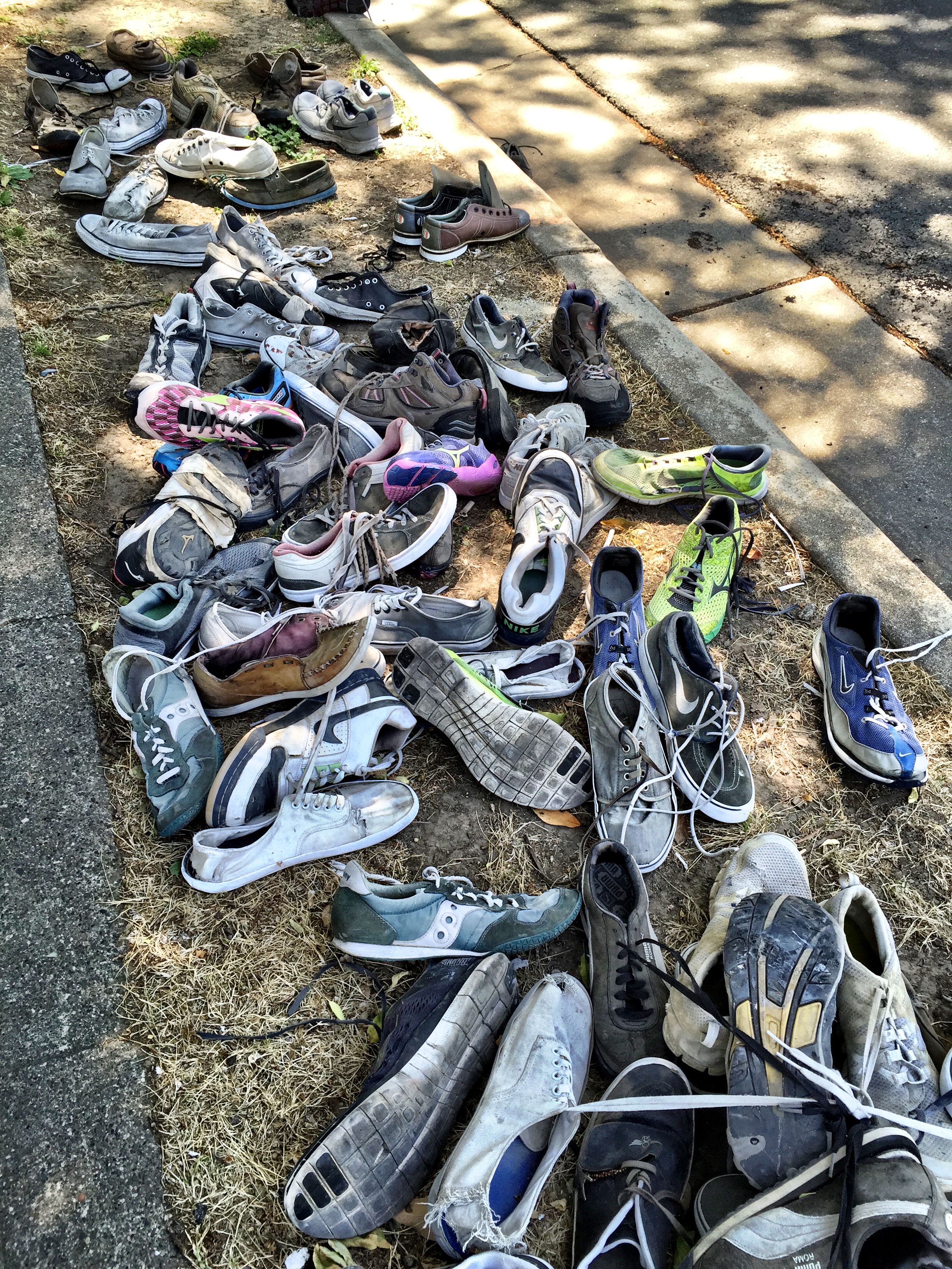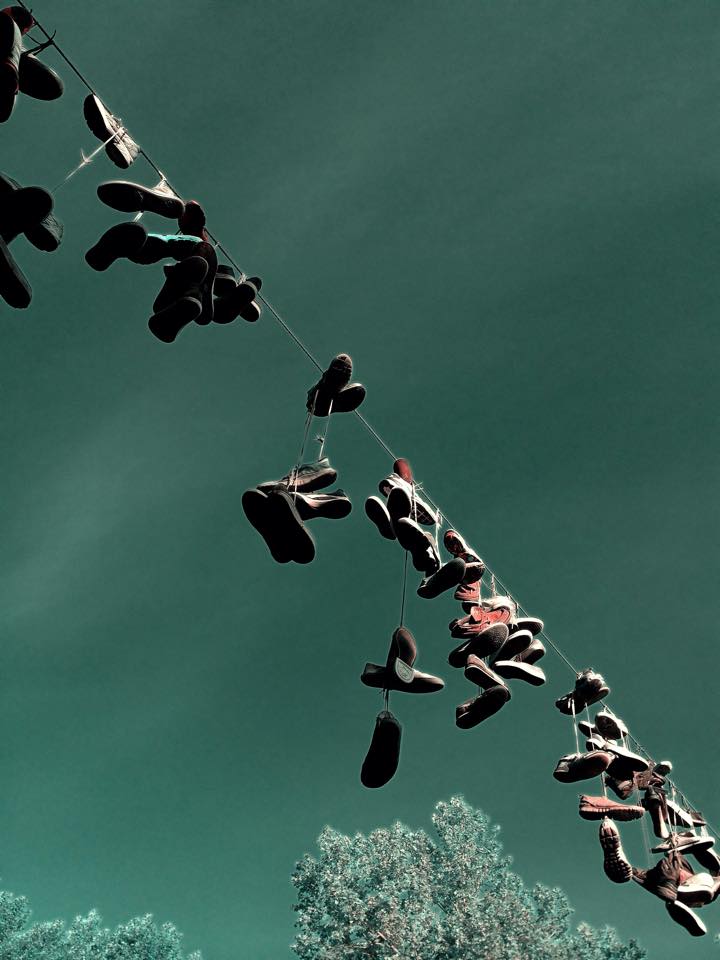 I know I have a few pictures of the hanging shoes, taken over the years, but for the life of me, I cannot find them in my crazy, extensive archive (which now totals 50,230 photos). So, I am posting one that Dave Webb–my iPhone photographer hero/mentor–took a few weeks ago…