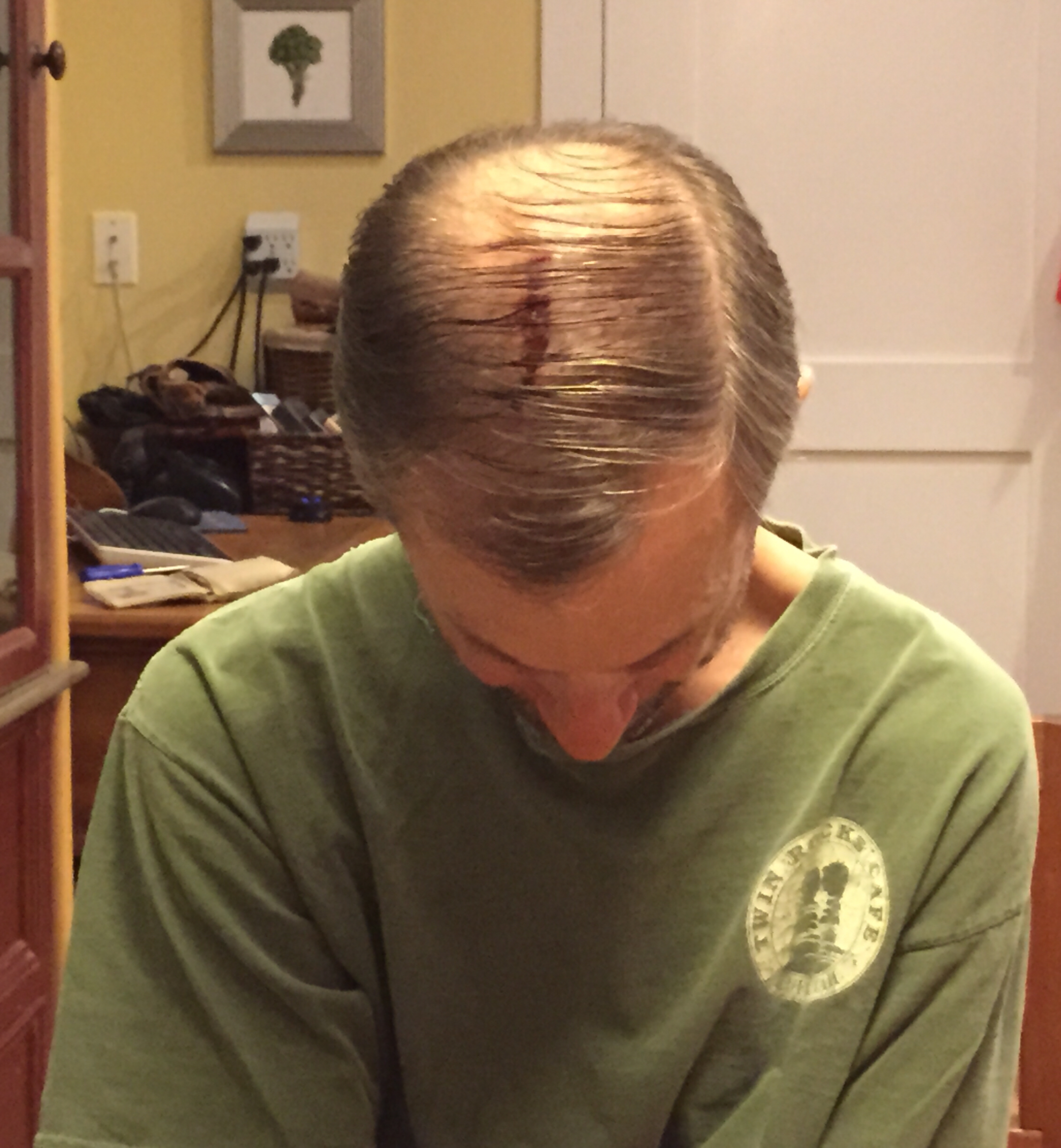Anyway… head wounds bleed a lot, but there is nowhere for the wound to go before you hit the skull, so it wasn’t terribly deep, if heavily vascularized.