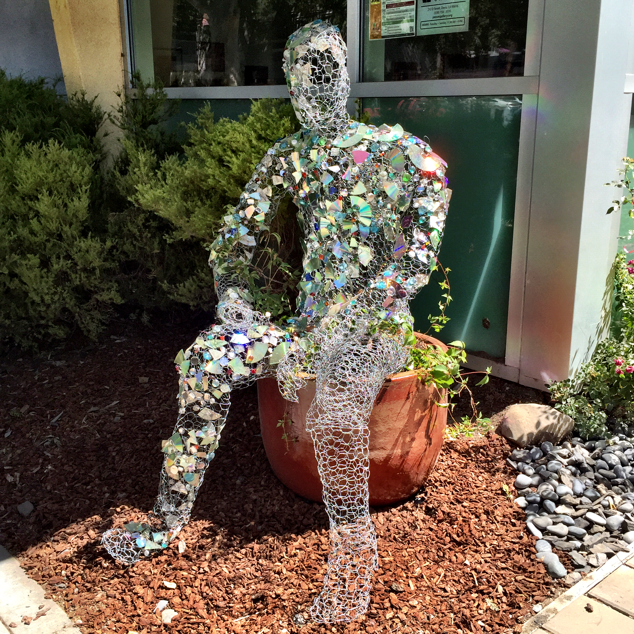 Here is, um, glass man. Sits in front of the Pence Gallery and shimmers like nobody’s business. Nice, if you like this kind of thing: