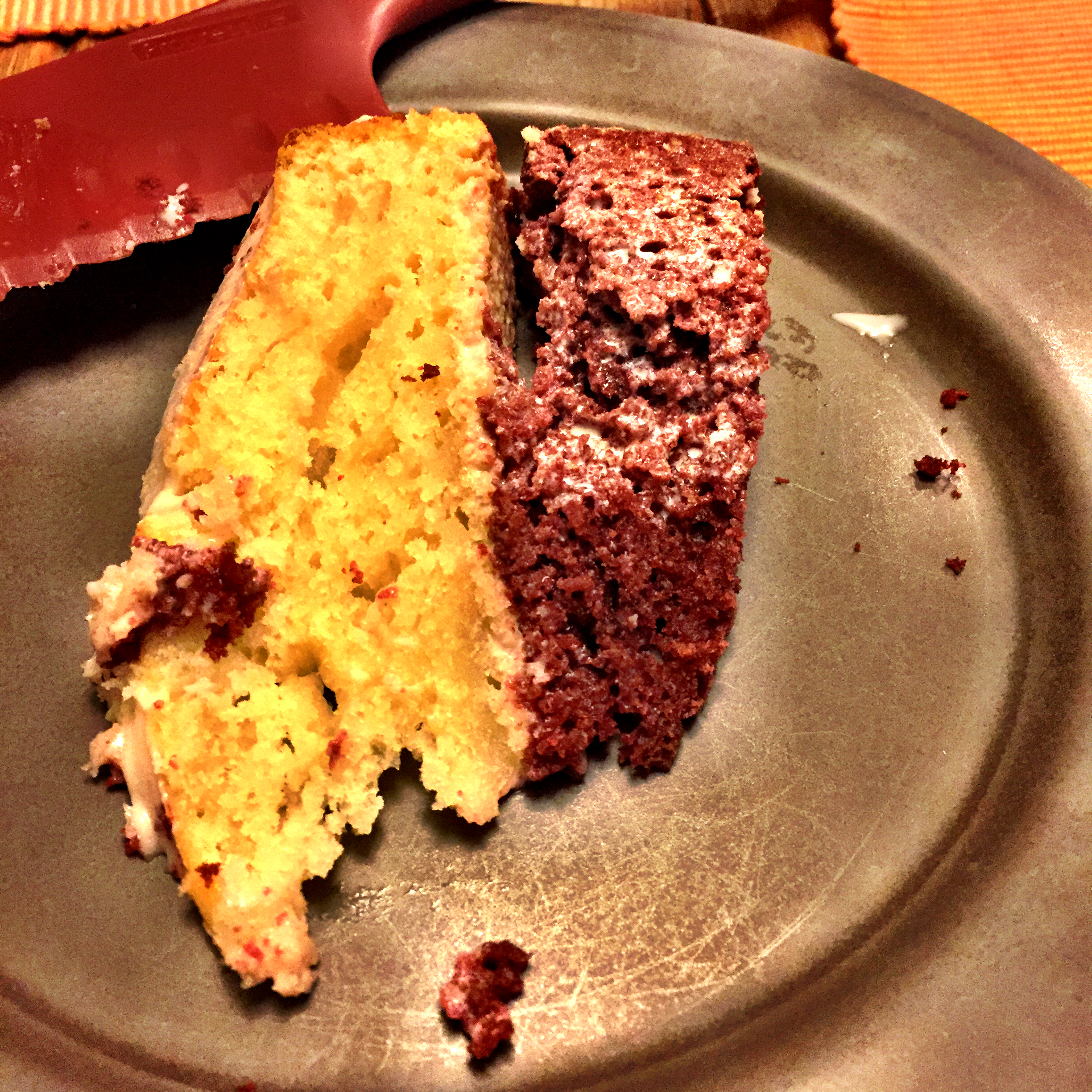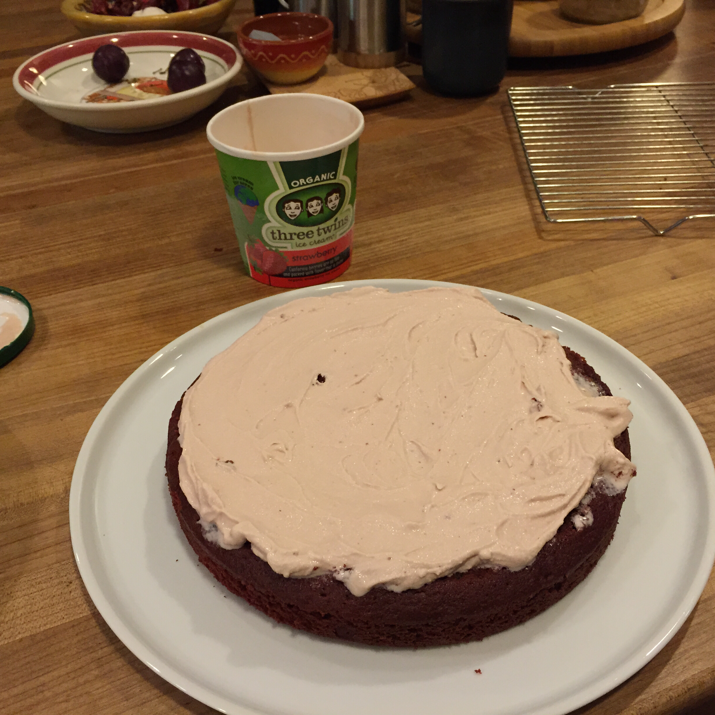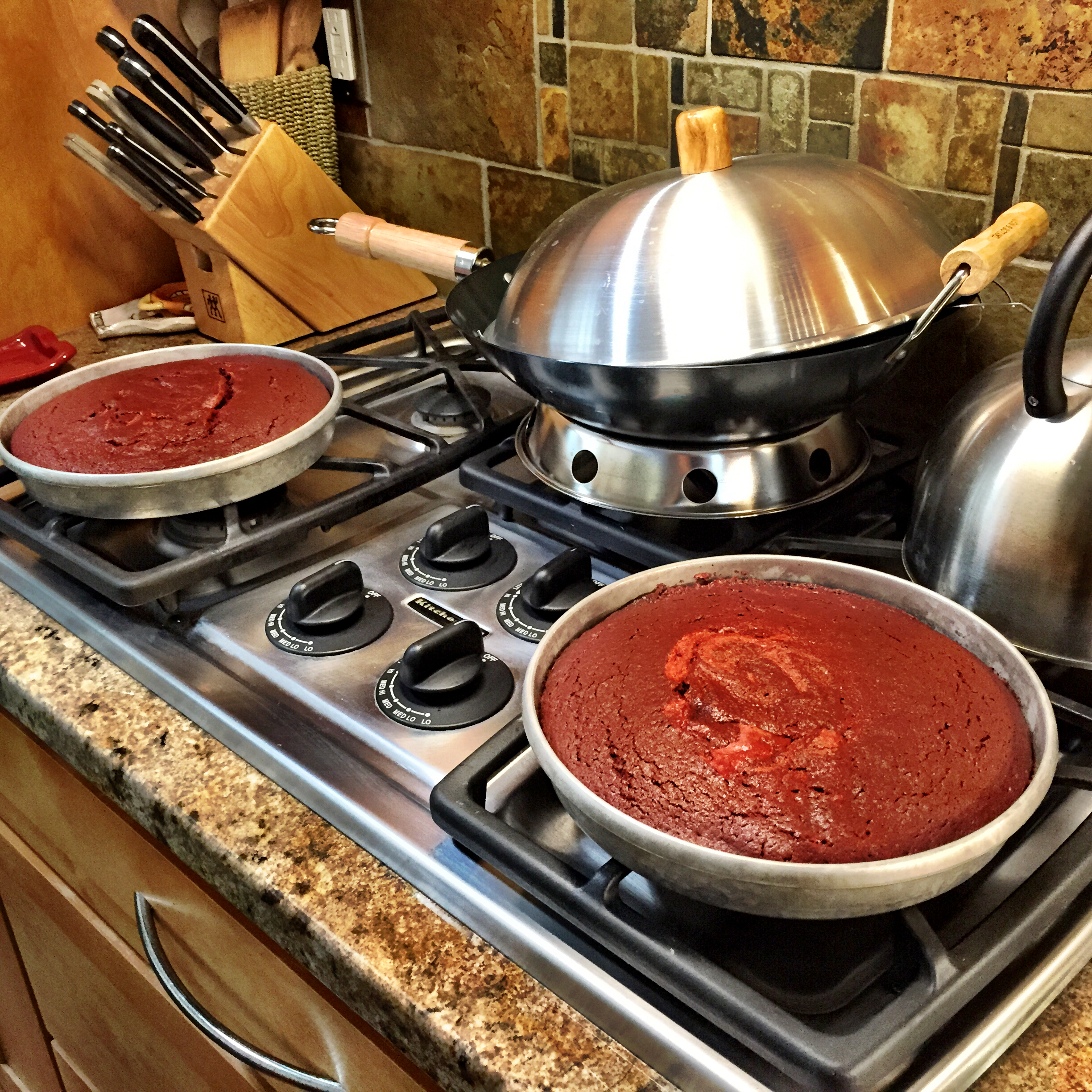 This year’s cake order was red velvet. He didn’t know that was chocolate and when he found out, he requested I modify in some interesting way, in particular he wanted a layer of vanilla… so… I made a red velvet bottom later:
