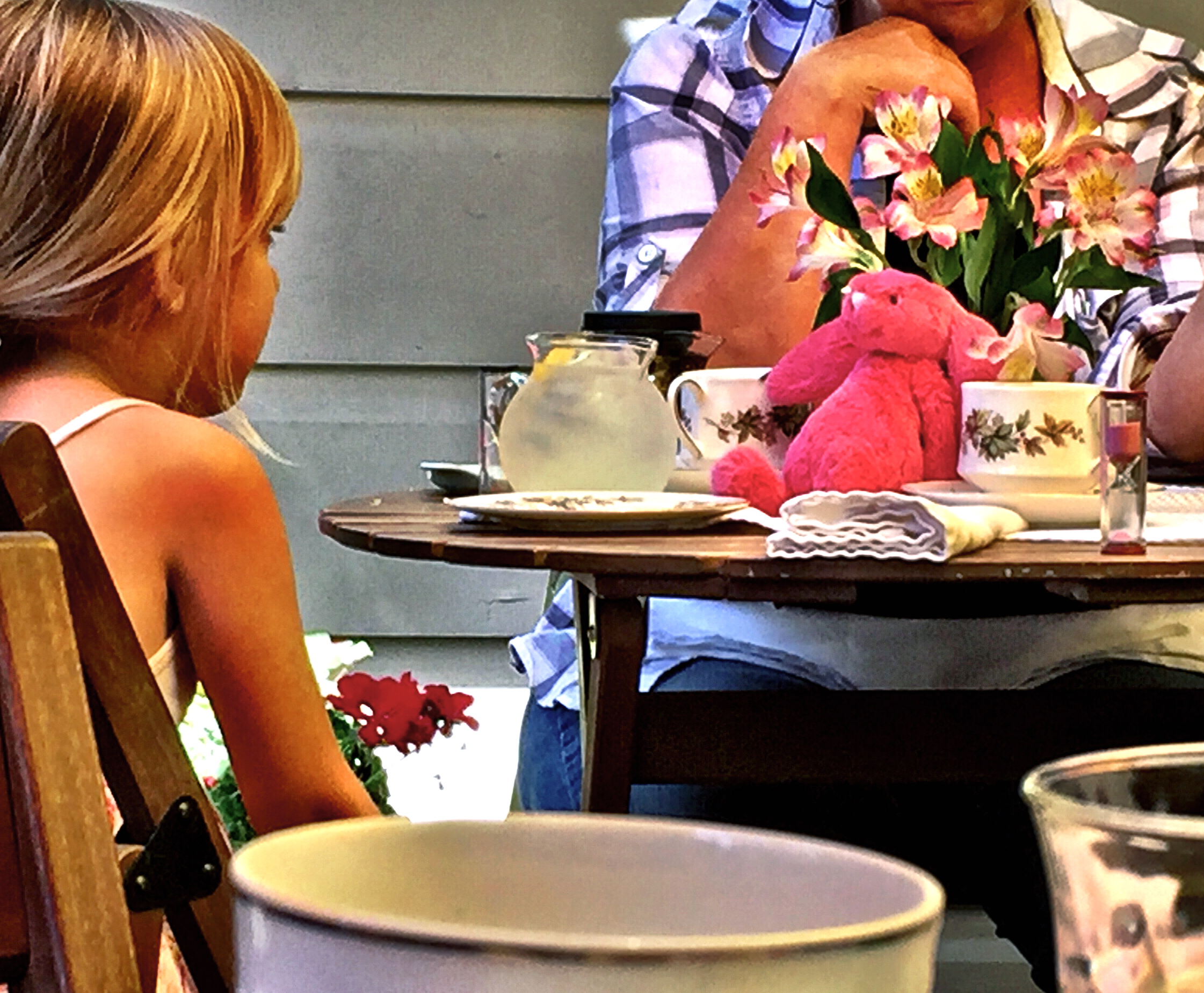 That is a tiny pitcher of lemonade just for her, and she brought her own stuffed bunny to the party. We were bunniless at our table.