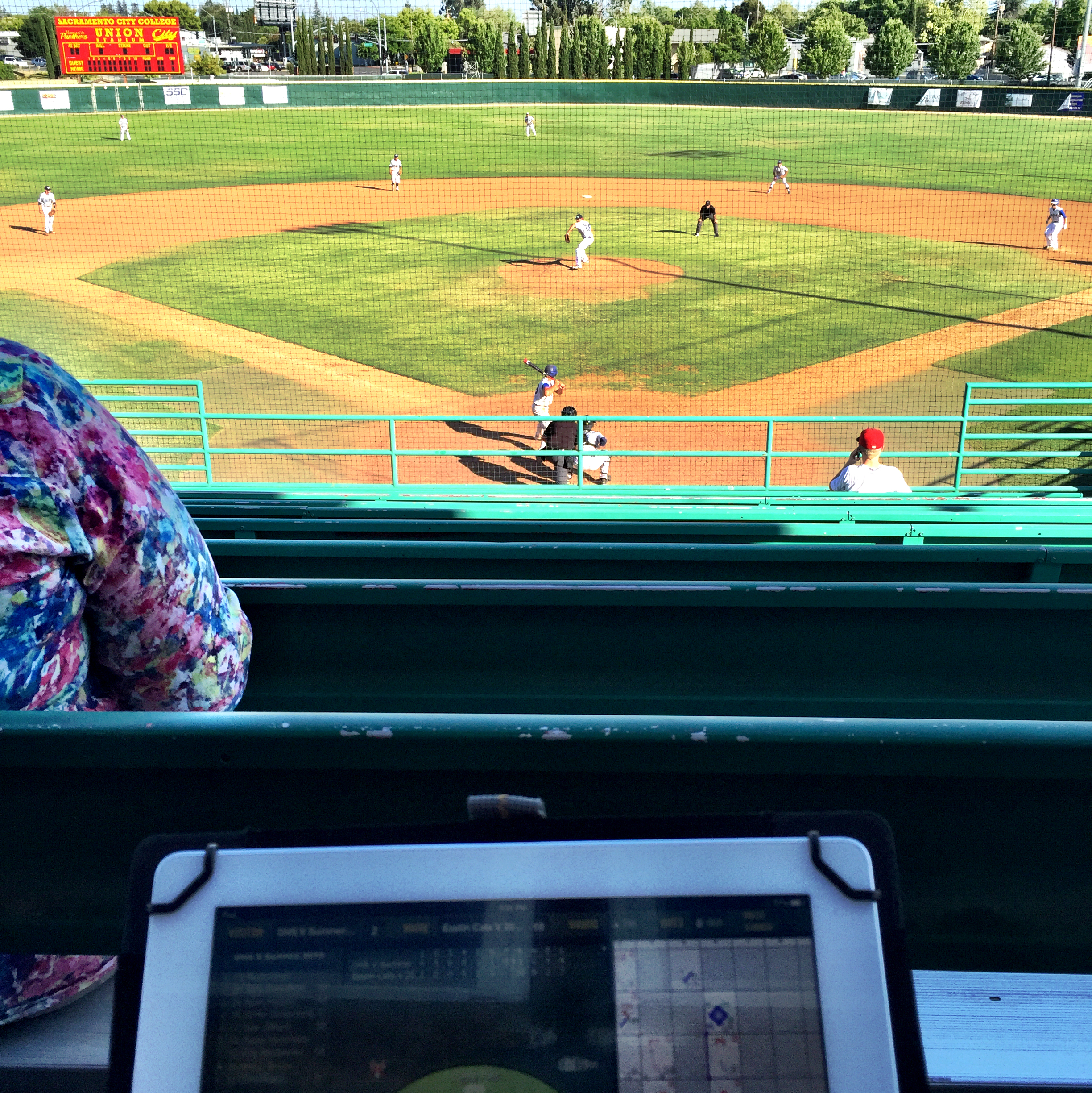 In the late afternoon heat, sat in a narrow swath of shade at the very top of the bleachers at Sac City College, scrambling to catch up on game data… a tedious process if you’re transitioning from your fall-back paper-based system to your vastly-preferable digital-based system mid-game, but that’s why god invented Dianna: