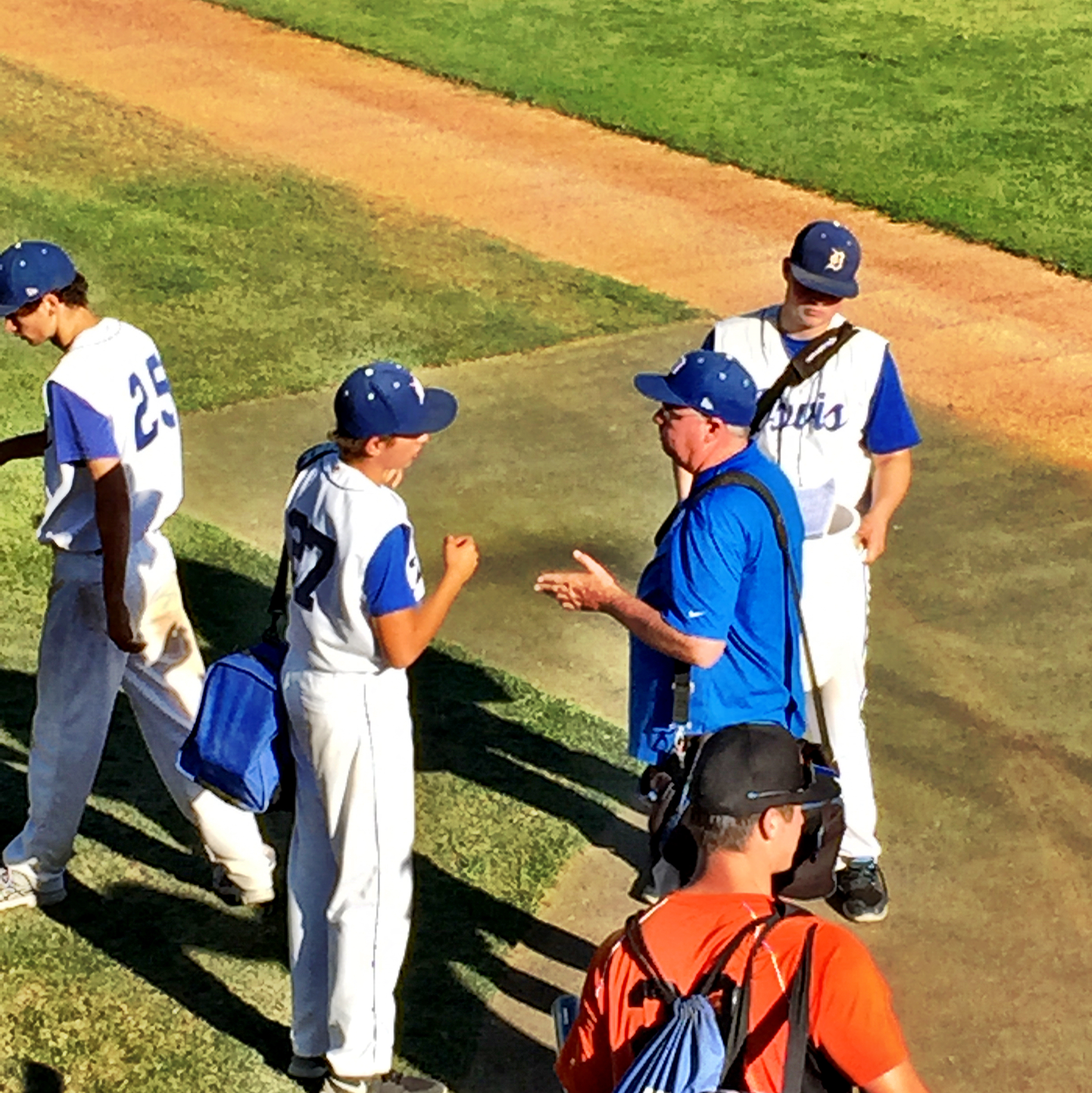 It was not a great day for the Blue Devils. Davis managed only two hits–not great–and committed four yucky, costly errors. The coaches, in full summer assessment mode, gave six pitchers an inning apiece… with very mixed results. Peter faced only three batters today (hurray!) in his inning and thankfully did just fine. In the end, it was the Eastin Cats 10 and Davis 2…ugly. Here is a post-game confab between Peter and his coach… sketching out the pitching strategy for this weekend’s tournament.