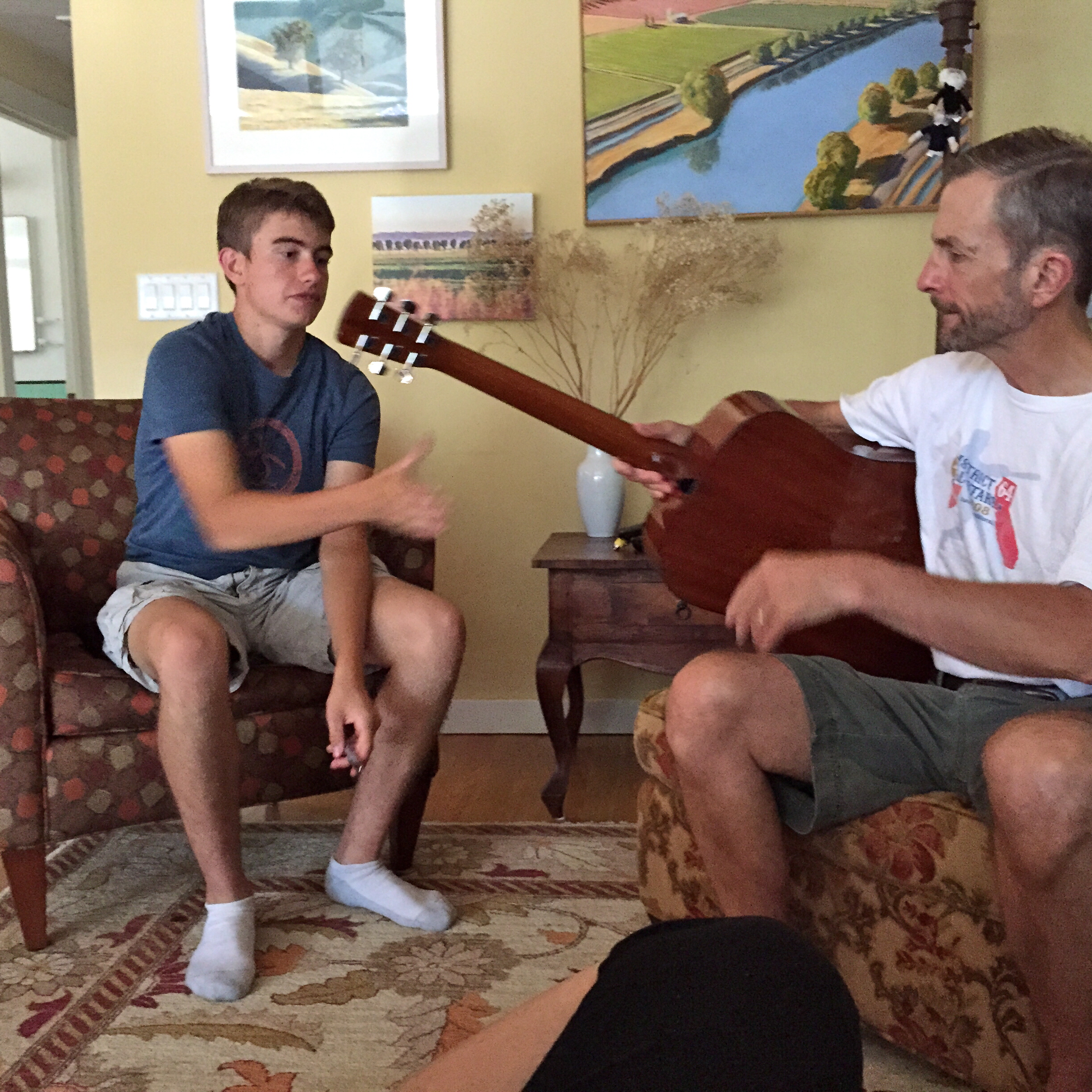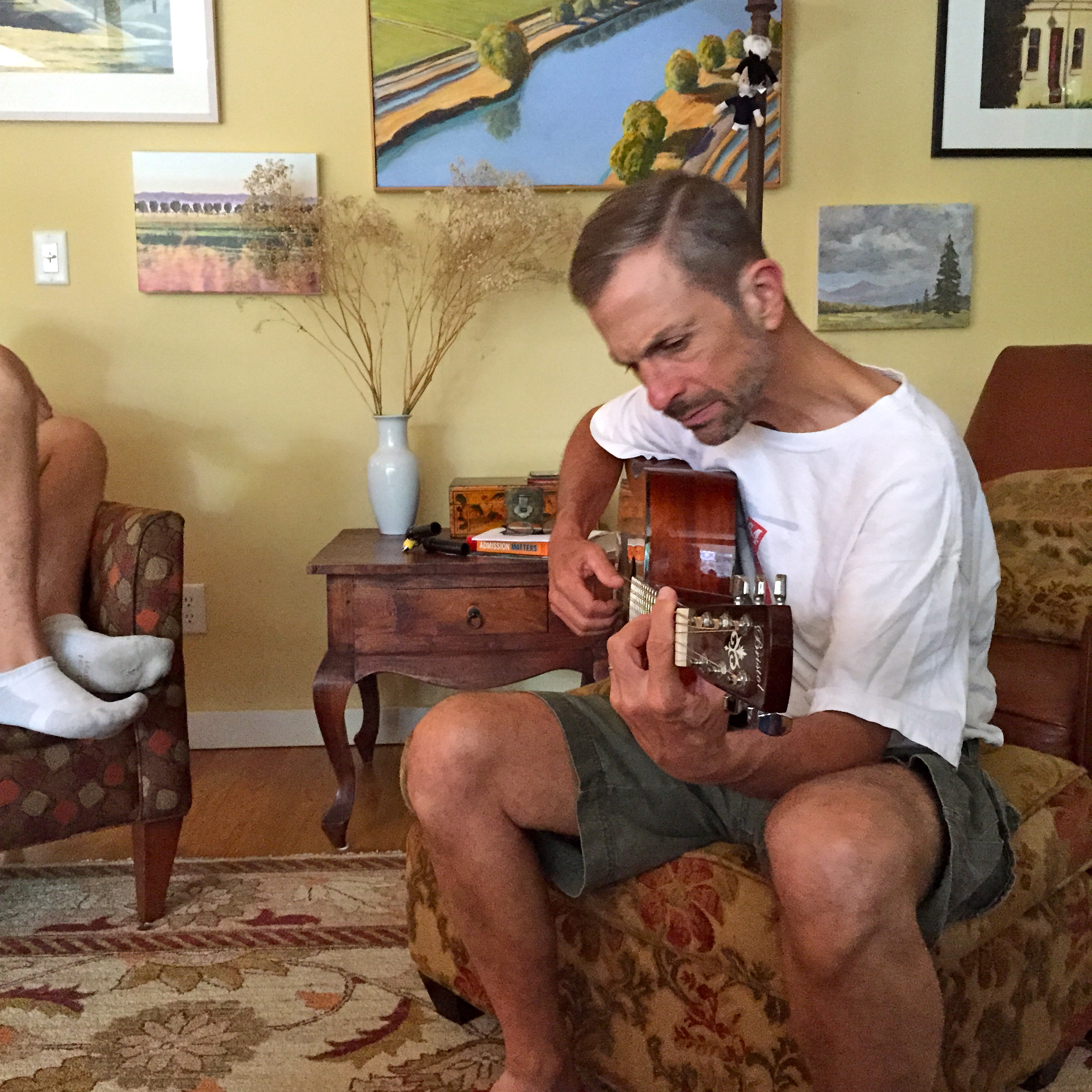 So, this afternoon, Peter and I return from an REI bender–last acquisitions before leaving on a coupla trips–and walk into the house to find Jim playing a little guitar on a Friday afternoon…