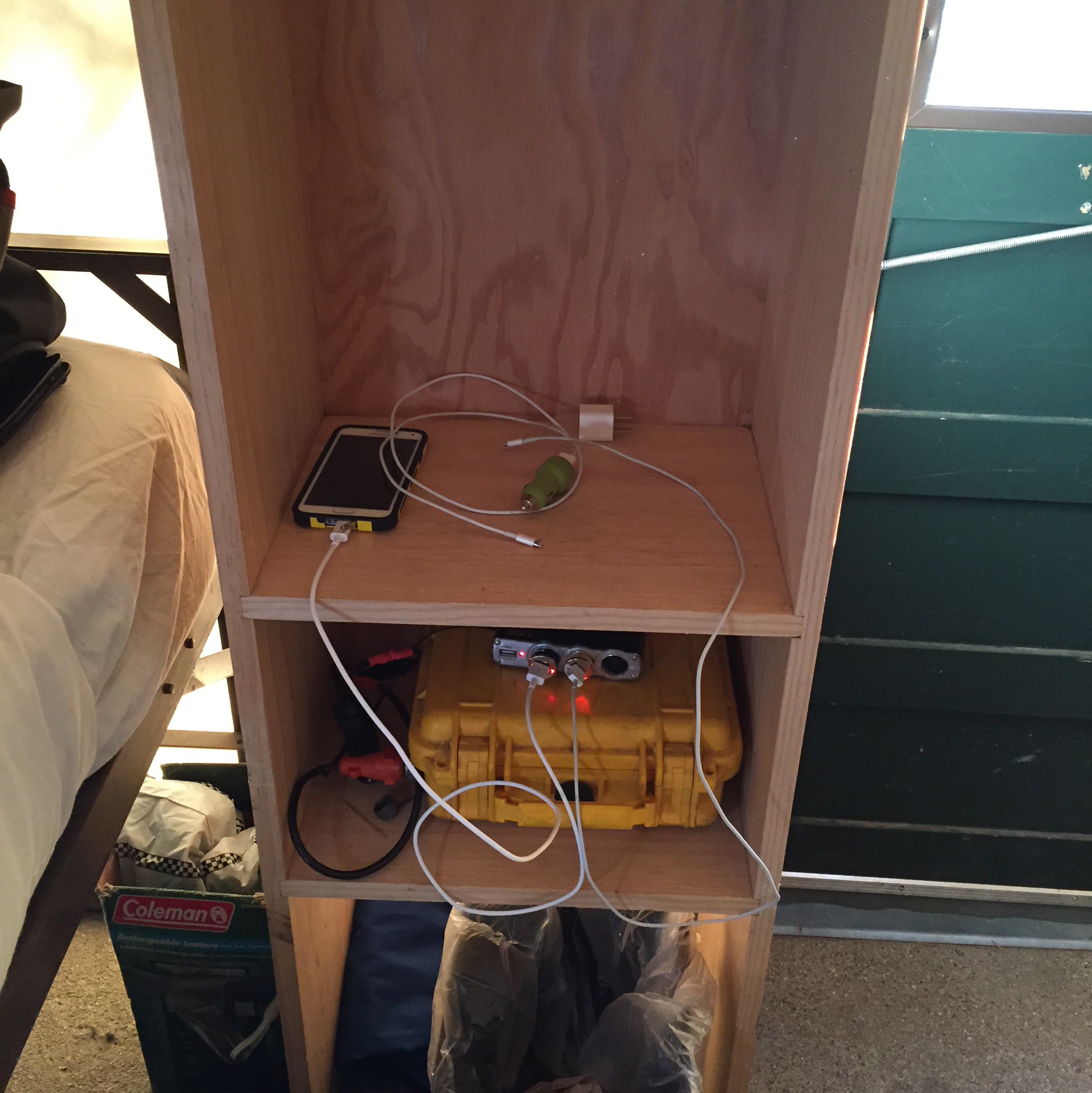 Cement floors, stained canvas sides, squeaky screen door… about 14 x 14′? There is a funky card table for stuff we need handy, a single sturdy plastic chair, never enough hooks to hang stuff on, a nice wood burning stove, and about three years ago, they added this goofy wooden shelf, which is where we put our makeshift charging station: