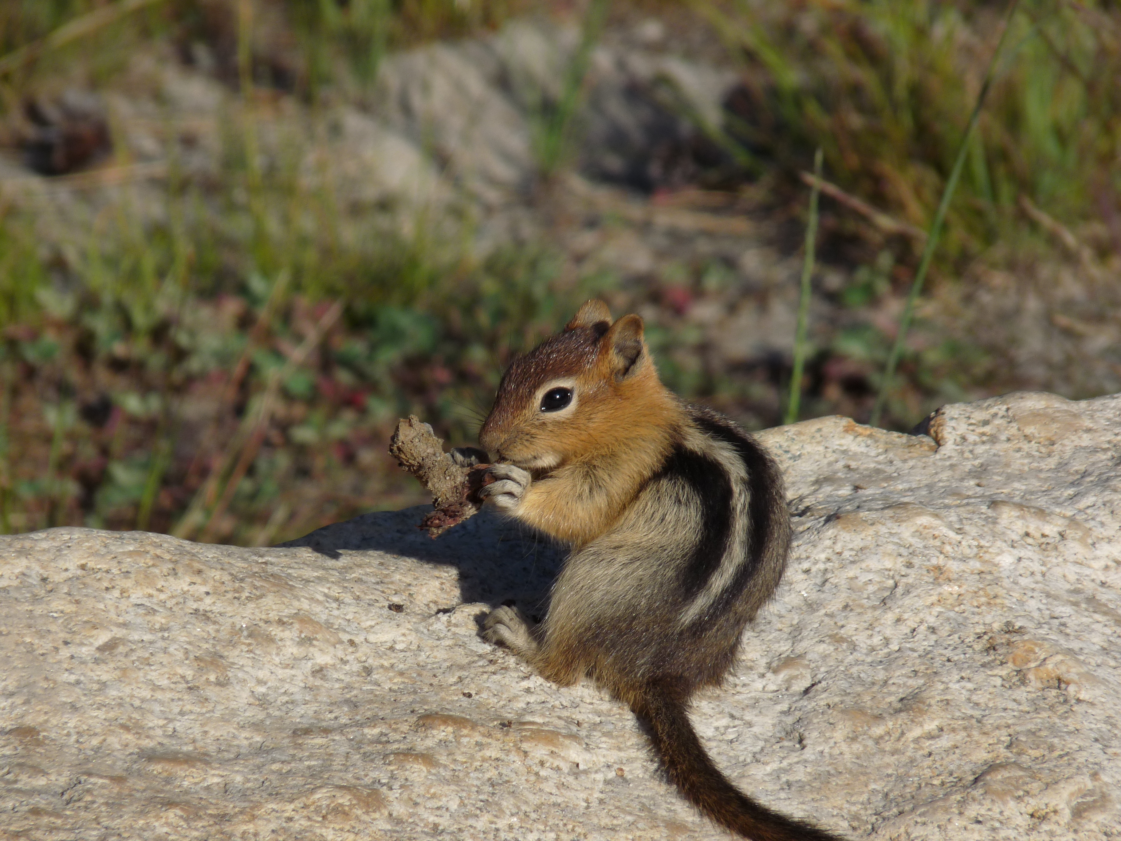 She was gnawing on what looked like a twig on a boulder in the parking lot.