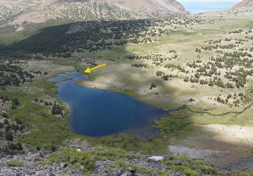 Here is a shot Jim took of Spillway from the crest.. and the arrow points to the rock where Peter and I were standing/sitting above. You can see Mono Lake in the distance.