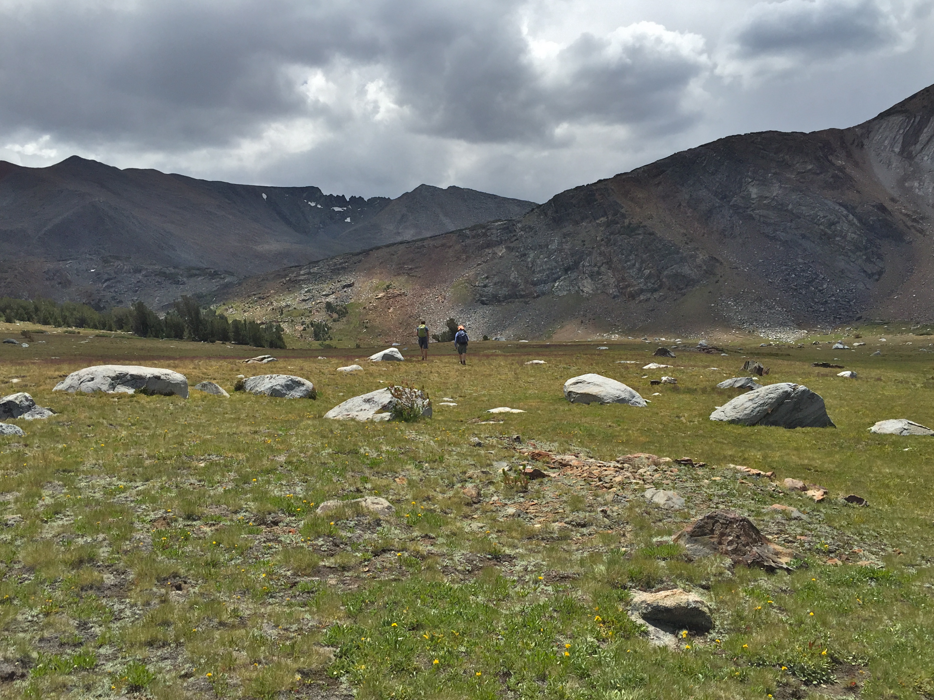 Then they took off for the crest and I ambled slowly back. The weather’s looking iffy, but they got in before any rain fell. They are headed around the end of Spillway, which is almost visible to the right, and then up the ridge, also on the right.