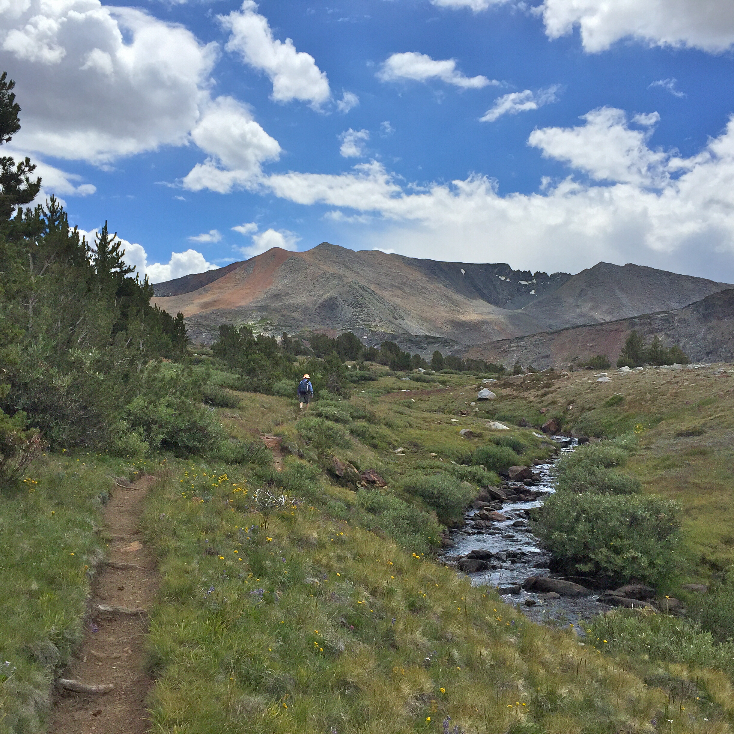I just love this area. I am pretty sure this was our absolute first hike when we first came to Tuolumne Meadows in 2000 with Rick and Gigi (and Peter, just 2 years old, in a backpack they gave us). I remember tearing up because it was so beautiful along this particular stretch of trail. I remember the water was roaring at numerous points in the climb up to the lake and the wlld flowers were dense. Bigger water years, for sure.