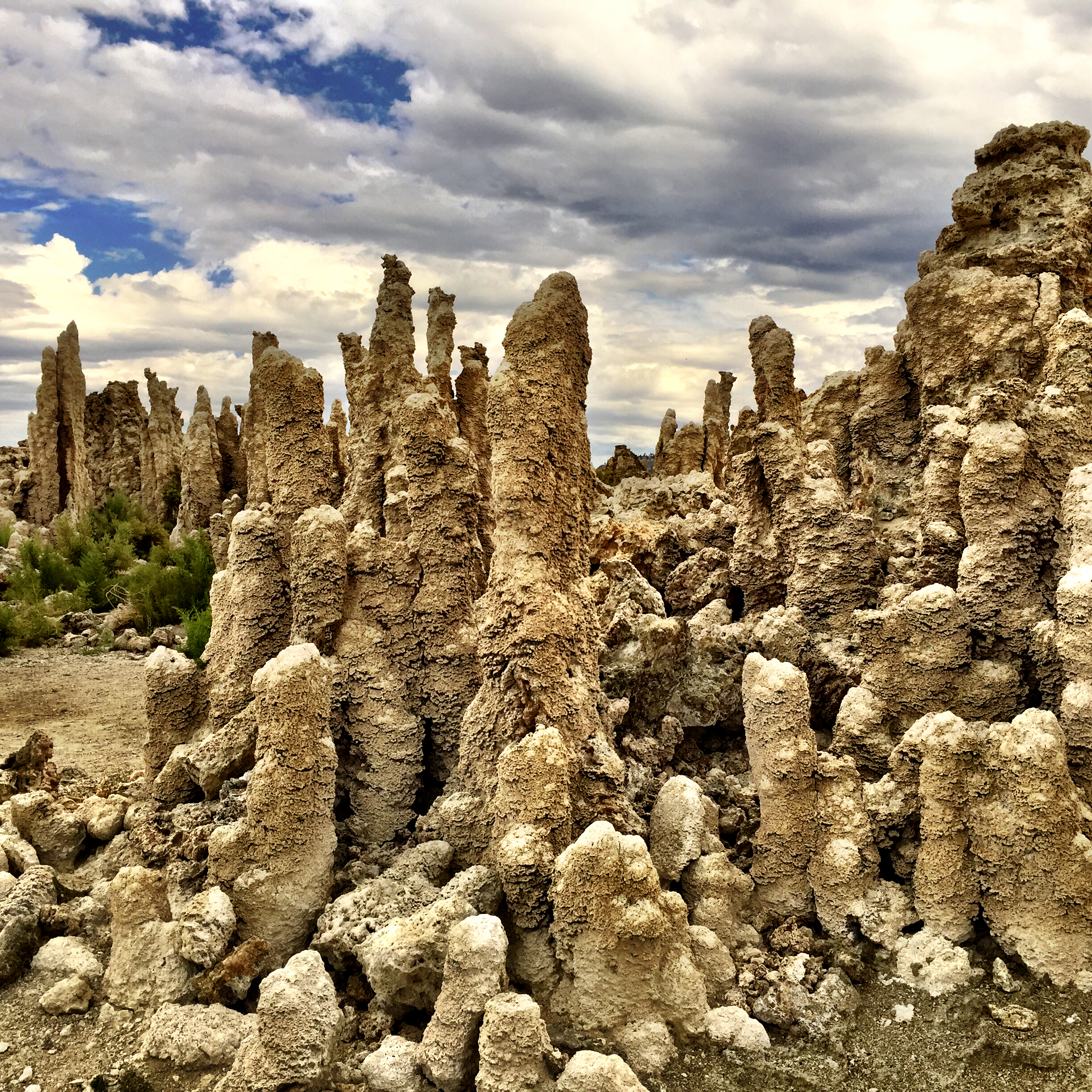 The exhibits at the Visitor’s Center were fascinating. Mono Lake, one of the oldest lakes in North America, and the basin in which it sits are unique for a number of reasons. 1. The basin is rife with volcanos (see photos/explanations below). 2. The lake has no outlet. Streams feed water into the lake, the water evaporates, and what’s left is water with a super high concentration of minerals. The water is very salty. 3. The volume of water in the lake is greatly reduced because at one point Los Angeles was allowed to divert water from streams that would have fed the lake and sustained healthy lake levels. Water policy and new regulations, starting in 1994, have begun to turn this around. 4. In the meantime, tufas–limestone towers–which generally grow underwater, are visible and line many of the now exposed shores (also see below).