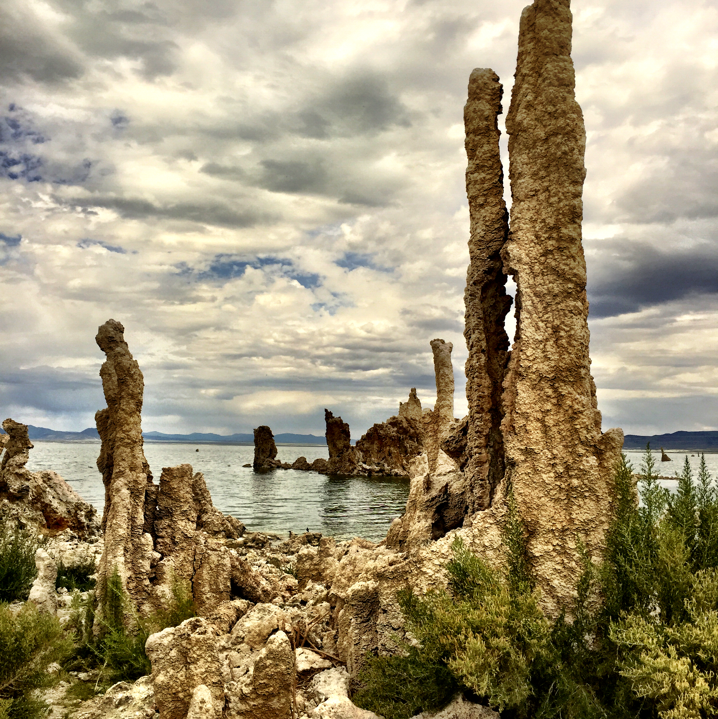 Got down, drove through Lee Vining, and parked at the Visitor’s Center. We had lunch on a bench overlooking Mono Lake. It’s cloudy over on the east side, too.
