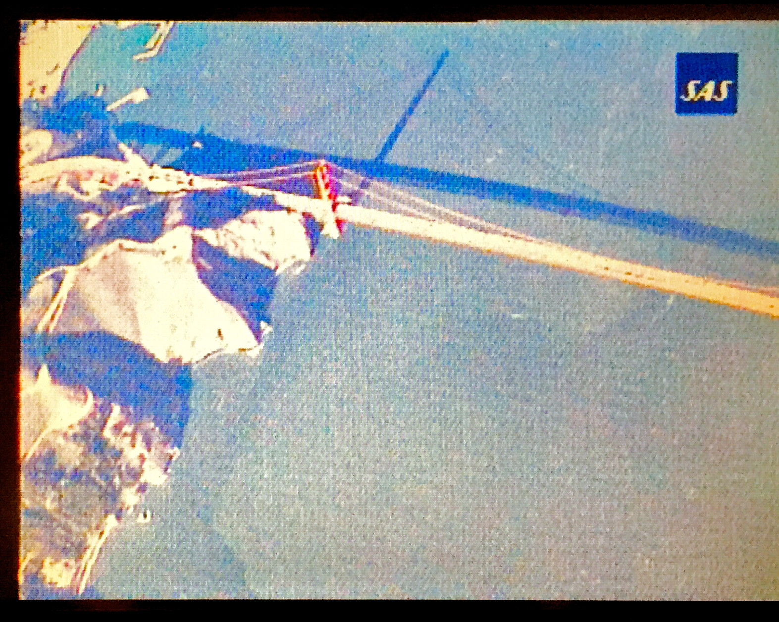 SAS did have this very cool set of cameras you could tune into if the in-flight movies didn’t grab you….especially appreciated if you were in one of those middle seats (in a 9-seat row) and couldn’t look out the window. Here’s a shot from the “looking down” camera, leaving the Bay Area…
