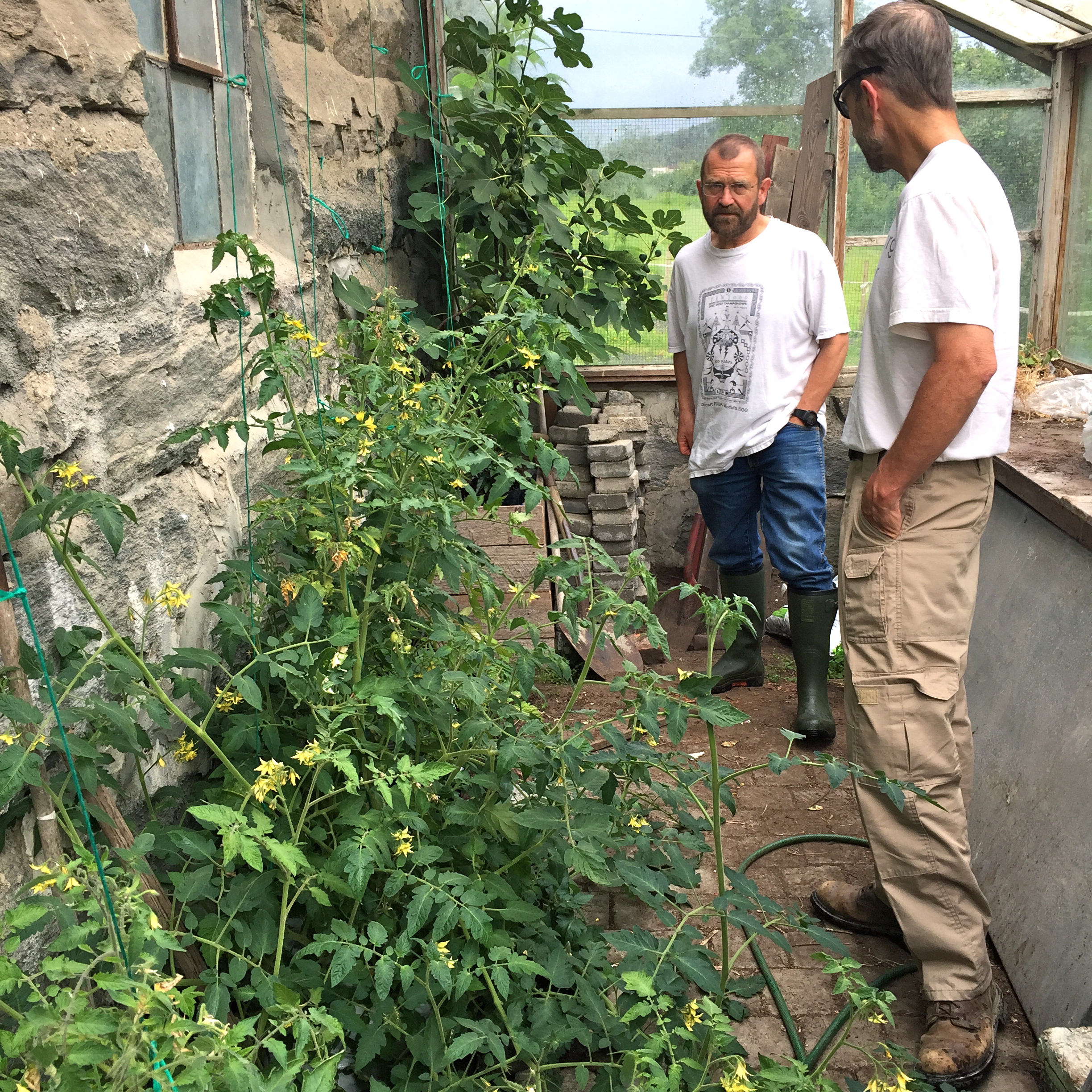 Typical of many (not all) cabins, theirs is a walk-in, in their case, a half a mile. We managed to haul everything in one trip. (In the winter, they ski in–albeit from further away because the road is not plowed–and use a sled… and believe it or not, the snow makes the terrain easier to travel.) Here’s Svein with full wheelbarrow and backpack… down rickety steps, boardwalks, strategically placed planks, across wet and boggy meadows, up hills, through tall grass and brush… all of that!